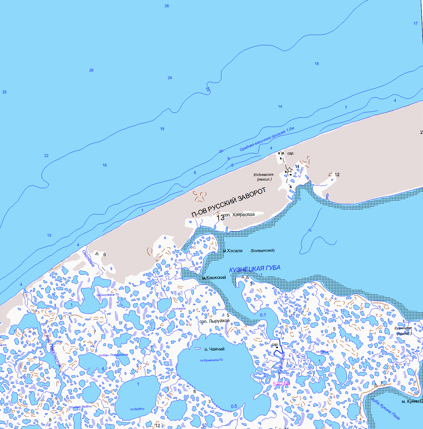 Полуостров, отделяющий Печерскую губу от Печерского моря, представляет собой узкую песчаную косу высотой 2—3 м и длиной около 45 км.