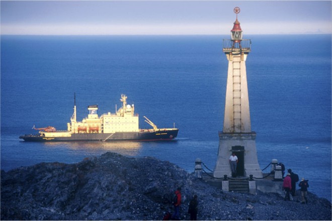 :": Ледокол "Капитан Хлебников" на якорной стоянке вблизи заброшенного маяка на мысе Дежнева. Июль 2003.