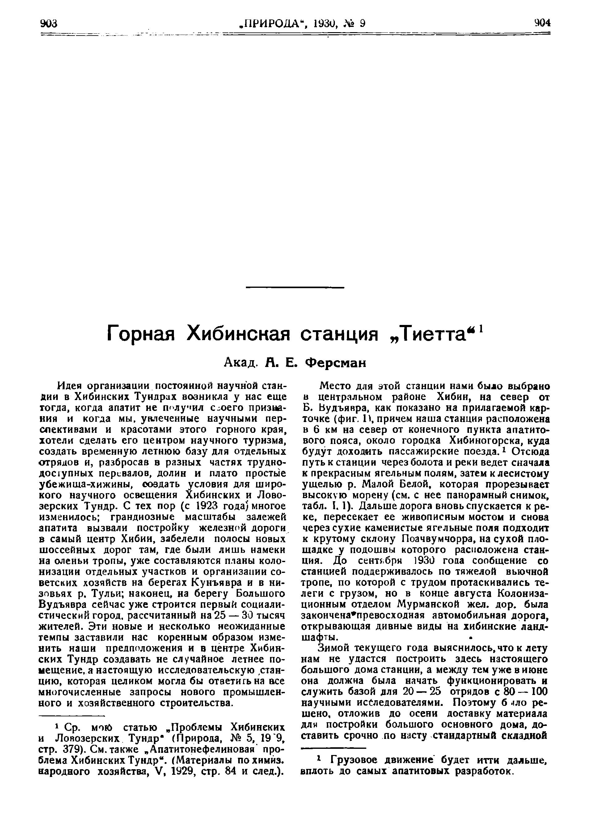 Наша горная станция Академии Наук поэтому не замыкается в узкие задачи изучения недр и их использования в горных районах Кольского полуострова, она должна явиться широким учреждением для всестороннего географического, геохимического и экономического изучения всех областей, прилегающих к Хибиногорску.