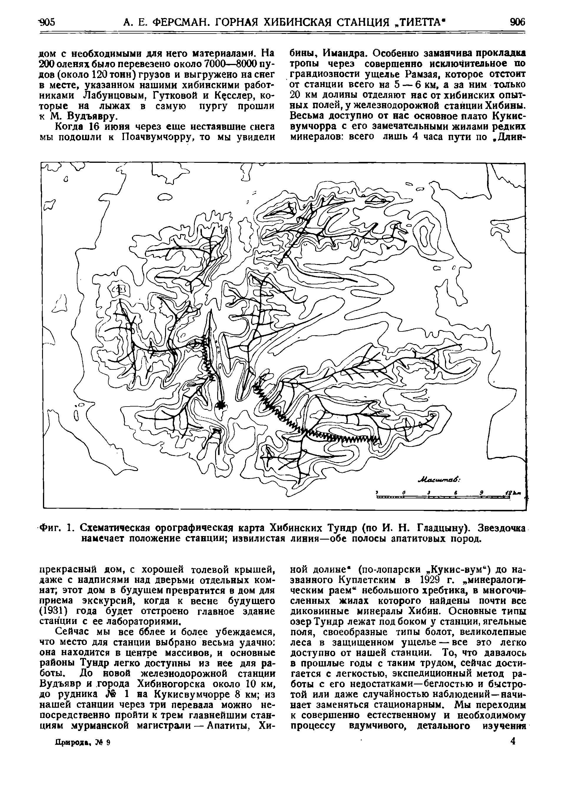 Сейчас мы все белее и более убеждаемся, что место для станции выбрано весьма удачно: она находится в центре массивов, и основные районы Тундр легко доступны из нее для работы. До новой железнодорожной станции Вудъявр и города Хибиногорска около 10 км, до рудника № 1 на Кукисвумчорре 8 км; из нашей станции через три перевала можно непосредственно пройти к трем главнейшим станциям мурманской магистрали — Апатиты, Хибины, Имандра. Особенно заманчива прокладка тропы через совершенно исключительное по грандиозности ущелье Рамзая, которое отстоит от станции всего на 5 — 6 км, а за ним только 20 км долины отделяют нас от хибинских опытных полей, у железнодорожной станции Хибины. Весьма доступно от нас основное плато Кукисвумчорра с его замечательными жилами редких минералов: всего лишь 4 часа пути по "Длинной долине" (по-лопарски „Кукис-вум“) до названного Куплетским в 1929 г. "минералогическим раем" небольшого хребтика, в многочисленных жилах которого найдены почти все диковинные минералы Хибин. Основные типы озер Тундр лежат под боком у станции, ягельные поля, своеобразные типы болот, великолепные леса в защищенном ущелье — все это легко доступно от нашей станции. То, что давалось в прошлые годы с таким трудом, сейчас достигается с легкостью, экспедиционный метод работы с его недостатками — беглостью и быстротой или даже случайностью наблюдений — начинает заменяться стационарным. Мы переходим к совершенно естественному и необходимому процессу вдумчивого, детального изучения отдельных явлений, изучения их во времени и в пространстве, в природной диалектике процессов изменения и превращения.