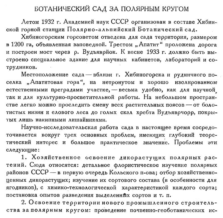 Хибиногорским горсоветом отведена для сада территория, размером в 1200 га, объявленная заповедной. Трестом „Апатит“ проложена дорога и построен мост через р. Вудъяврйок. К весне 1933 г. должно быть выстроено специальное здание для научных кабинетов, лабораторий и сотрудников.
