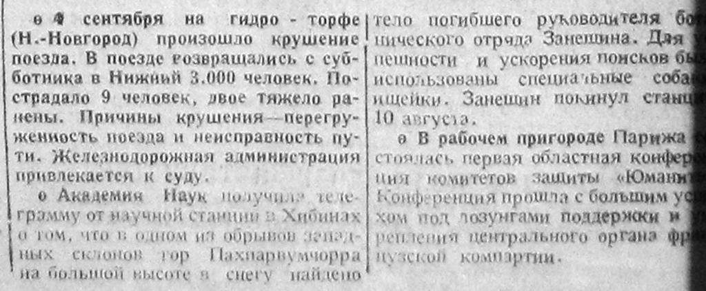 Академия Наук получила телеграмму от научной станции в Хибинах о том, что в одном из обрывов западных склонов гор Пахнарвумчорра [Тахтарвумчорр] на большой высоте в снегу найдено тело погибшего руководителя ботанического отряда Занешина[Ганешин С. С.]Для успешности и ускорения поисков были использованы специальные собаки ищейки. Занешин [Ганешин С. С.] покинул станцию 10 августа.