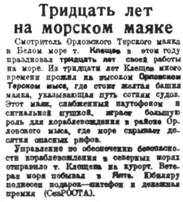 Смотритель Орловского Терского маяка в Белом море т. Клещев в этом году праздновал тридцать лет своей работы на море. Из тридцати лет Клещев много времени прожил на высоком Орловском Терском мысе, где стоит желтая башня маяка, указывающая путь сотням судов. Этот маяк, снабженный наутофоном и сигнальной пушкой, играет большую роль для кораблевождения в районе Орловского мыса, где море скрывает десятки опасных рифов.