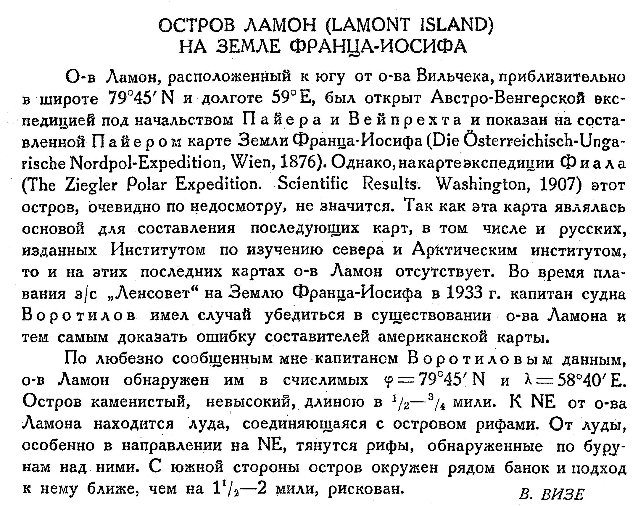 О-в Ламон, расположенный к югу от о-ва Вильчека, приблизительно в широте 79°45'N и долготе 59° Е, был открыт Австро-Венгерской экспедицией под начальством Пайера и Вейпрехта и показан на составленной Пайером карте Земли Франца-Иосифа (Die Osterreichisch-Ungarische Nordpol-Expedition, Wien, 1876). Однако, на карте экспедиции Фиала (The Ziegler Polar Expedition. Scientific Results. Washington, 1907) этот остров, очевидно по недосмотру, не значится. Так как эта карта являлась основой для составления последующих карт, в том числе и русских, изданных Институтом по изучению севера и Арктическим институтом, то и на этих последних картах о-в Ламон отсутствует. Во время плавания з/с „Ленсовет" на Землю Франца-Иосифа в 1933 г. капитан судна Воротилов имел случай убедиться в существовании о-ва Ламона и тем самым доказать ошибку составителей американской карты.