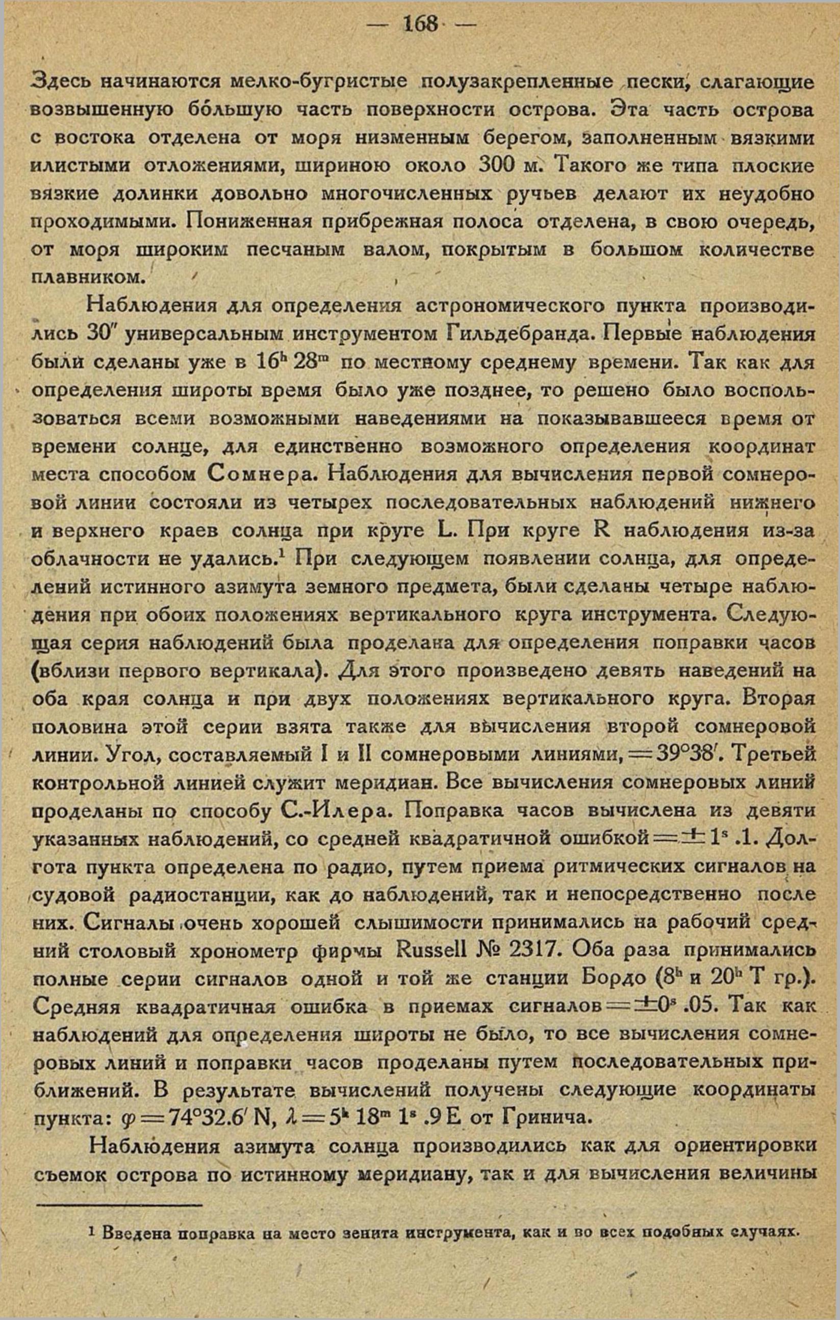 s.1. Долгота пункта определена по радио, путем приема ритмических сигналов на судовой радиостанции, как до наблюдений, так и непосредственно после них. Сигналы очень хорошей слышимости принимались на рабочий средний столовый хронометр фирмы Russell № 2317. Оба раза принимались полные серии сигналов одной и той же станции Бордо (8