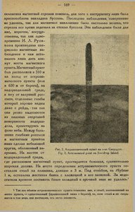 склонения магнитной стрелки компаса, для чего к инструменту нами была приспособлена накладная буссоль. Последние наблюдения совершенно не удались, так как магнитное наклонение было, настолько велико, что стрелка все время задевала за стекло буссоли. Эти наблюдения были для нас, впрочем, несущественны, так как одновременно И. Л. Руси¬нова производила спе¬циально магнитные наблюдения и нам оставалось лишь дать азимут места магнитного пункта. Магнитный пункт был расположен в 310 м на запад от астрономического пункта (или в 630 м от берега), на водораздельной гряде, к югу от валунной россыпи, отдельные глыбы которой хорошо видны даже с рейда, так как они резко выделяются из плавных очертаний поверхности водораздела, проектируясь на фоне неба. Между большими глыбами россыпи и магнитным пунктом нами сделан небольшой курган, обложенный валунами. На восток от водораздельной гряды, где расположен магнитный пункт, простирается большая, сравнительно широкая долина. На месте определения астрономического пункта поставлен столб из плавника, длиною в 3 м. Под столбом, на глубине 1 м, оставлена жестяная банка с вложенной в нее запиской. За недостатком времени поставить более солидный и прочный знак не удалось. {1}