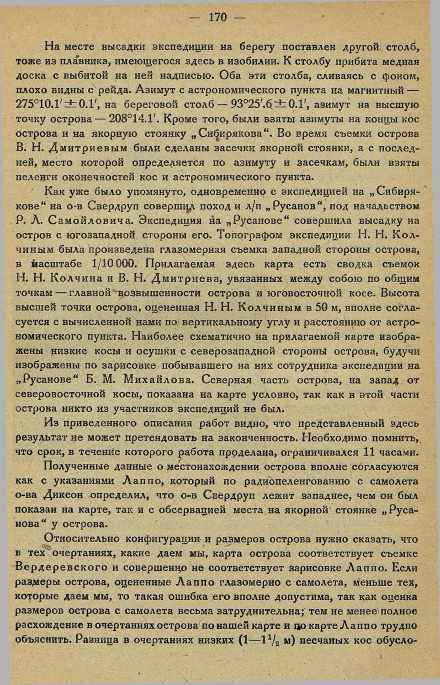 Как уже было упомянуто, одновременно с экспедицией на "Сибирякове" на о-в Свердруп совершил поход и л/п "Русанов", под начальством Р. Л. Самойловича. Экспедиция на "Русанове" совершила высадку на остров с югозападной стороны его. Топографом экспедиции Н. Н. Колчиным была произведена глазомерная съемка западной стороны острова, в масштабе 1/10000. Прилагаемая здесь карта есть сводка съемок Н. Н. Колчина и В. Н. Дмитриева, увязанных между собою по общим точкам — главной возвышенности острова и юговосточной косе. Высота высшей точки острова, оцененная Н. Н. Колчиным в 50 м, вполне согласуется с вычисленной нами по вертикальному углу и расстоянию от астрономического пункта. Наиболее схематично на прилагаемой карте изображены низкие косы и осушки с северозападной стороны острова, будучи изображены по зарисовке побывавшего на них сотрудника экспедиции на "Русанове" Б. М. Михайлова. Северная часть острова, на запад от северовосточной косы, показана на карте условно, так как в этой части острова никто из участников экспедиций не был.
