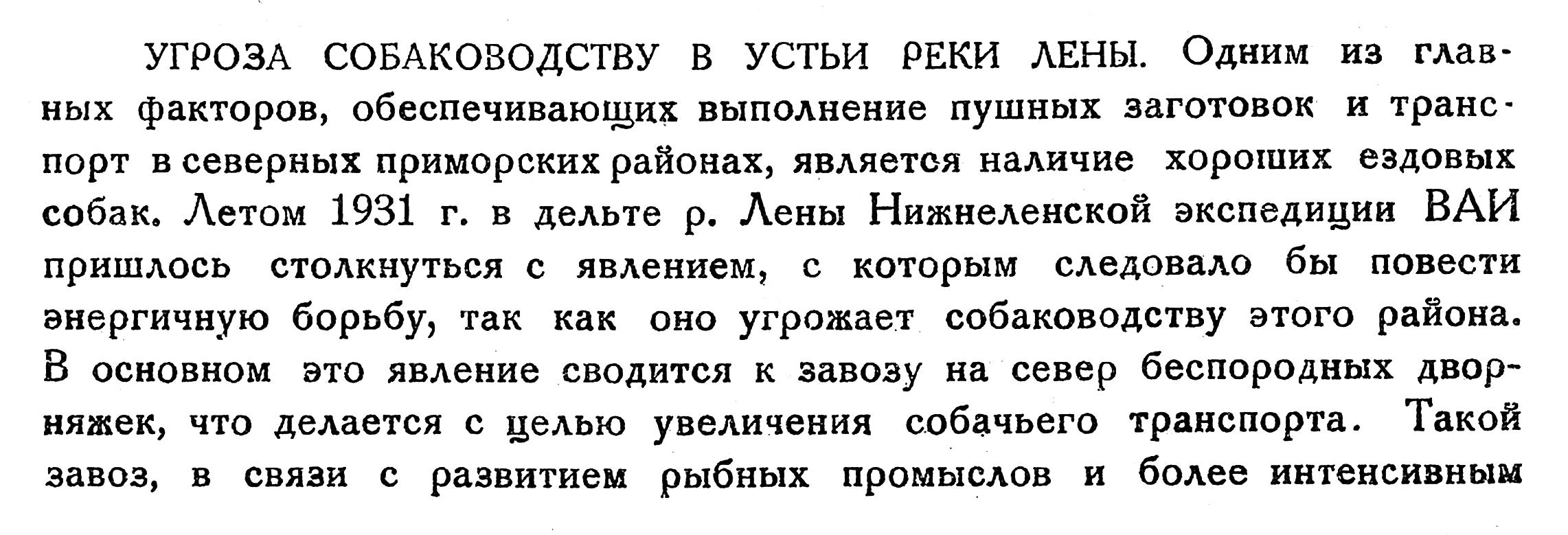 Л. 12. …. Местный транспорт. … Местная ездовая и охотничья собака – колымская лайка. За последние десятилетия её качества понизились вследствие примеси чёрной и не всегда высококачественной крови. Для улучшения породы собак основан в Петушках (65км вниз от Нижне-Колымска) собачий питомник, начавший работу с 1933 года….