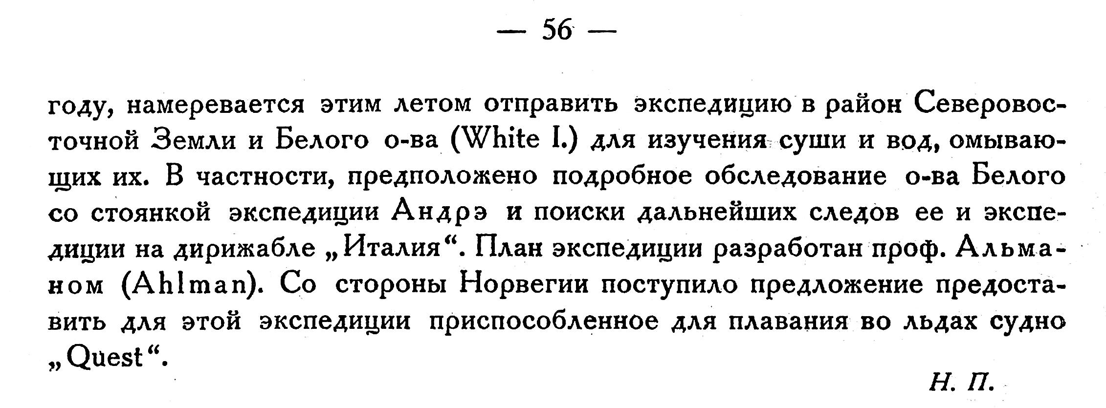 году, намеревается этим летом отправить экспедицию в район Северовосточной Земли и Белого о-ва (White I.) для изучения суши и вод, омывающих их. В частности, предположено подробное обследование о-ва Белого со стоянкой экспедиции Андрэ и поиски дальнейших следов ее и экспедиции на дирижабле „Италия". План экспедиции разработан проф. Альманом (AhIman). Со стороны Норвегии поступило предложение предоставить для этой экспедиции приспособленное для плавания во льдах судно „Quest“.