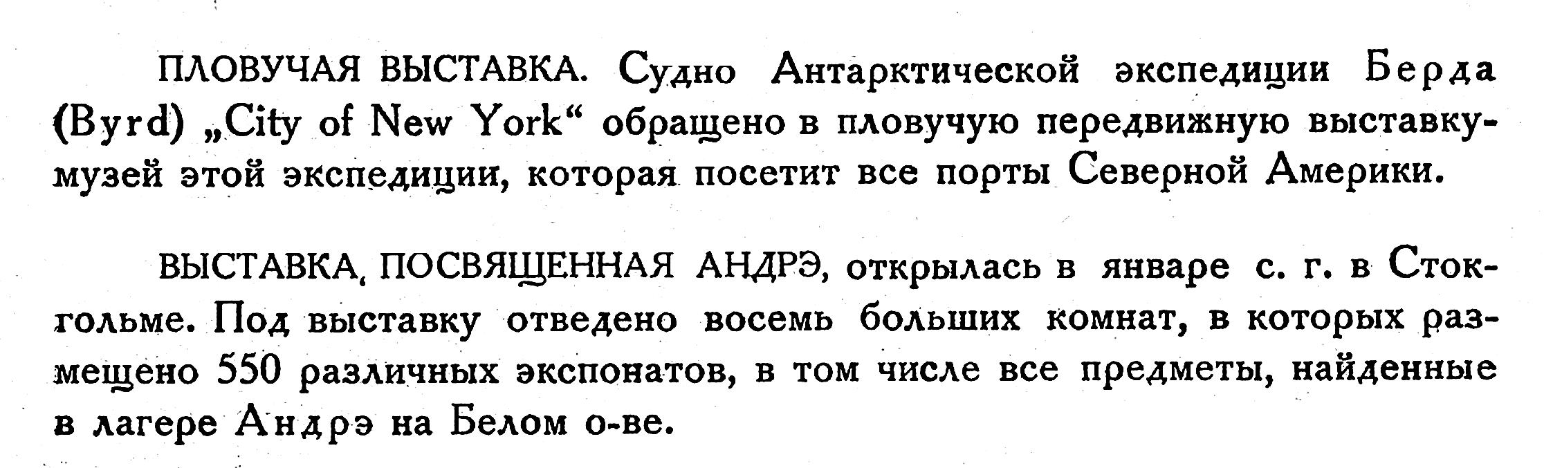 ВЫСТАВКА, ПОСВЯЩЕННАЯ АНДРЭ, открылась в январе с. г. в Стокгольме. Под выставку отведено восемь больших комнат, в которых размещено 550 различных экспонатов, в том числе все предметы, найденные в лагере Андрэ на Белом о-ве.
