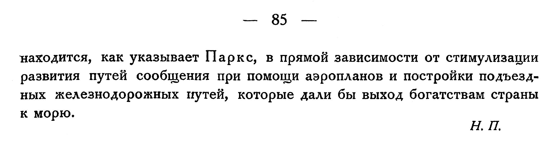 находится, как указывает Паркс, в прямой зависимости от стимулизации развития путей сообщения при помощи аэропланов и постройки подъездных железнодорожных путей, которые дали бы выход богатствам страны к морю.
