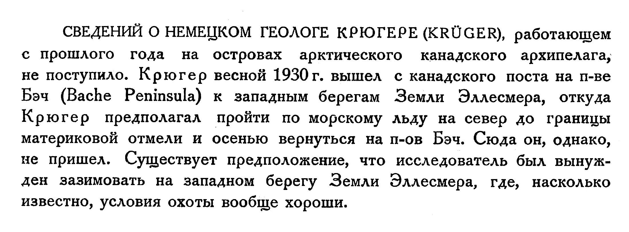 СВЕДЕНИЙ О НЕМЕЦКОМ ГЕОЛОГЕ КРЮГЕРЕ (KRŰGER), работающем с прошлого года на островах арктического канадского архипелага, не поступило. Крюгер весной 1930г. вышел с канадского поста на п-ве Бэч (Bache Peninsula) к западным берегам Земли Эллесмера, откуда Крюгер предполагал пройти по морскому льду на север до границы материковой отмели и осенью вернуться на п-ов Бэч. Сюда он, однако, не пришел. Существует предположение, что исследователь был вынужден зазимовать на западном берегу Земли Эллесмера, где, насколько известно, условия охоты вообще хороши.