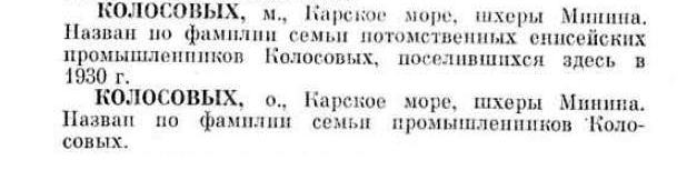 «Оставшиеся до конца навигации дни А.К. Бурке использовал для доставки промышленников в шхеры Минина. Там на пустынных островах, расположенных под 74°56' с. ш. 86°36' в. д , экипаж «Белухи» выстроил промысловое зимовье. В нем осталась небольшая группа охотников – семья потомственных енисейских промышленников Колосовых. Ныне эта группа островов носит название Колосовых».