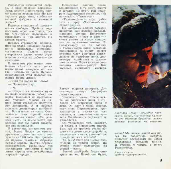 Расвумчорр – это название дали лопари. Оно обозначает: «плоская вершина горы, покрытая травой». Трава, или, вернее, мох, – важное обстоятельство. Можно пасти оленей. Но ещё важнее то, что установили геологи: весь массив горы состоит из апатита – природного минерального удобрения, «хлебного камня». Тонна апатита в поле – это две-три тонны хлеба. Природа постаралась, чтобы создать здесь площадку для большой химии.