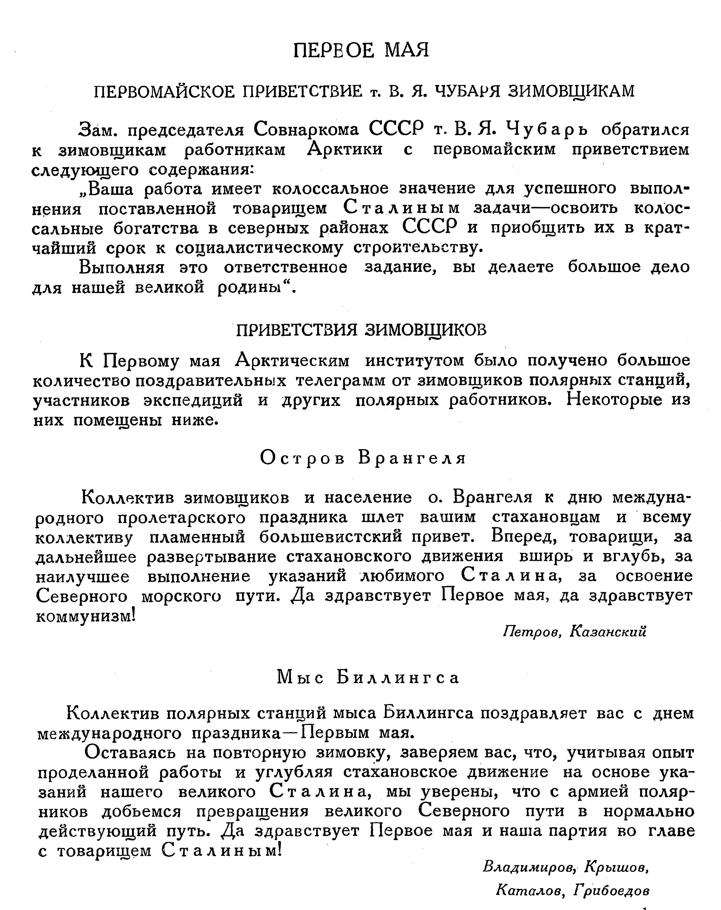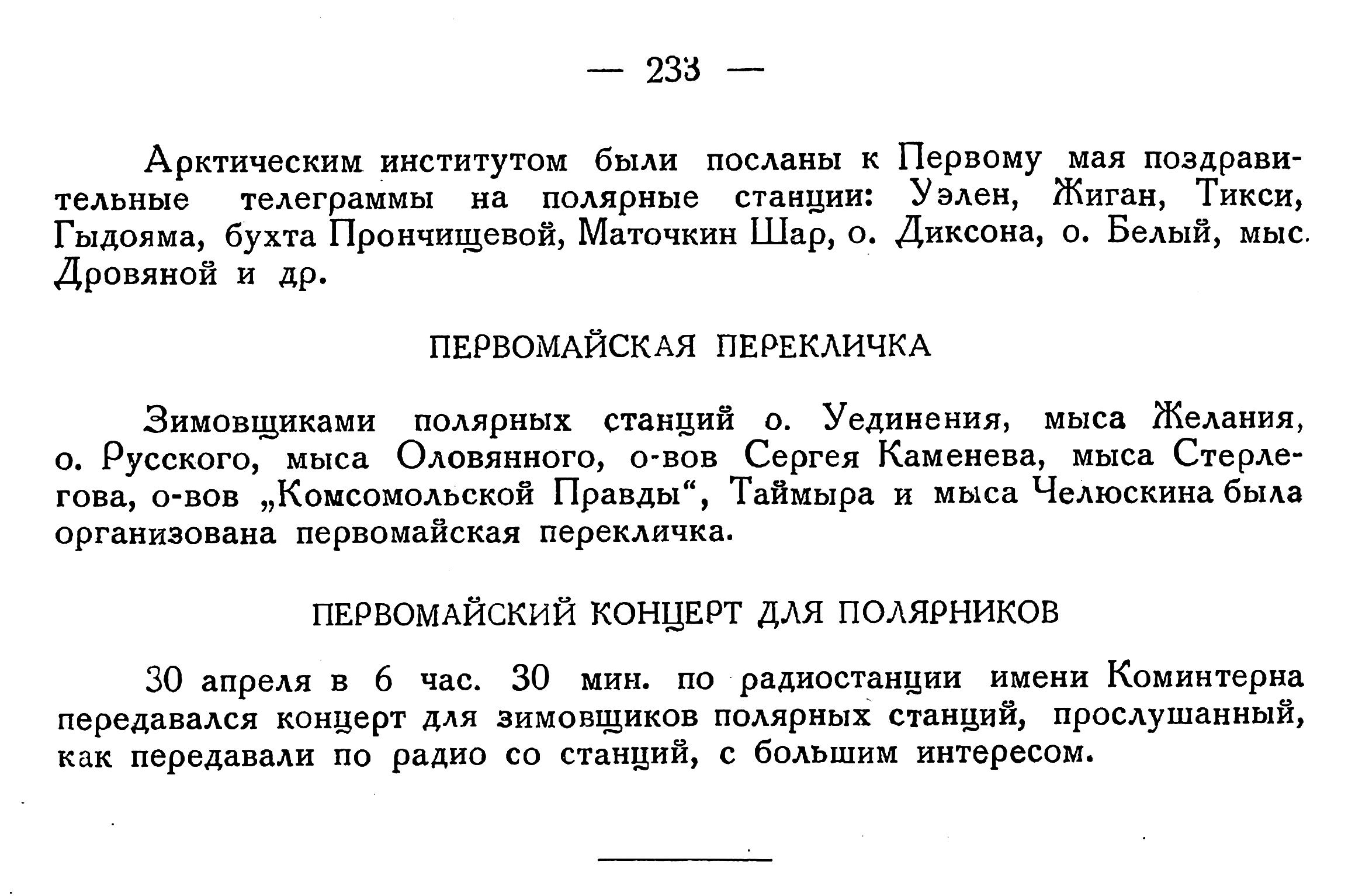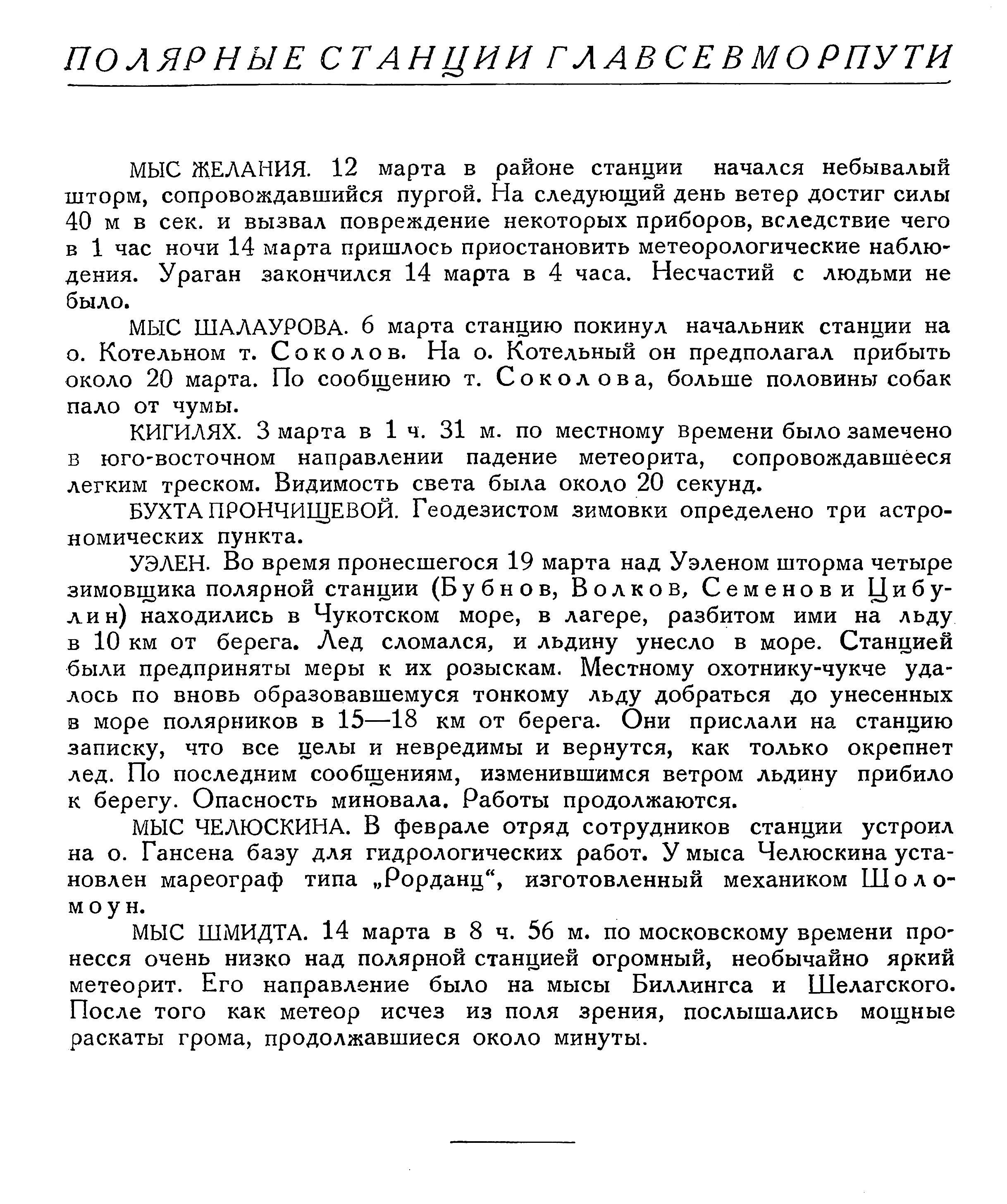 МЫС ШАЛАУРОВА. В январе сгорела полярная станция. Огнем уничтожена большая часть аппаратуры станции и имущества зимовщиков. Радиостанция уцелела; в ней временно размещены зимовщики.