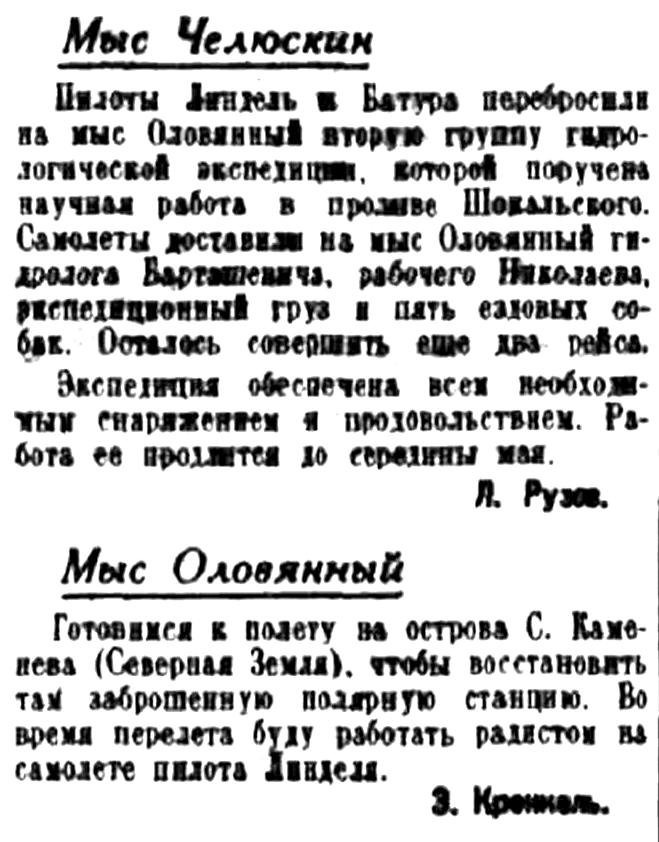 МЫС ЧЕЛЮСКИН. 1 марта. (Радио. спец. корр. "Правды"). Как известно, челюскинец Эрнст Кренкель возглавляет зимовку в составе всего 4 человек на мысе Оловянном. На днях, как сообщалось в "Правде" (в № от 29 февраля), летчик Линдель доставил с мыса Челюскина на мыс Оловянный гидрологическую группу, во главе с гидрологом Даниловым, приборы, четырех собак.