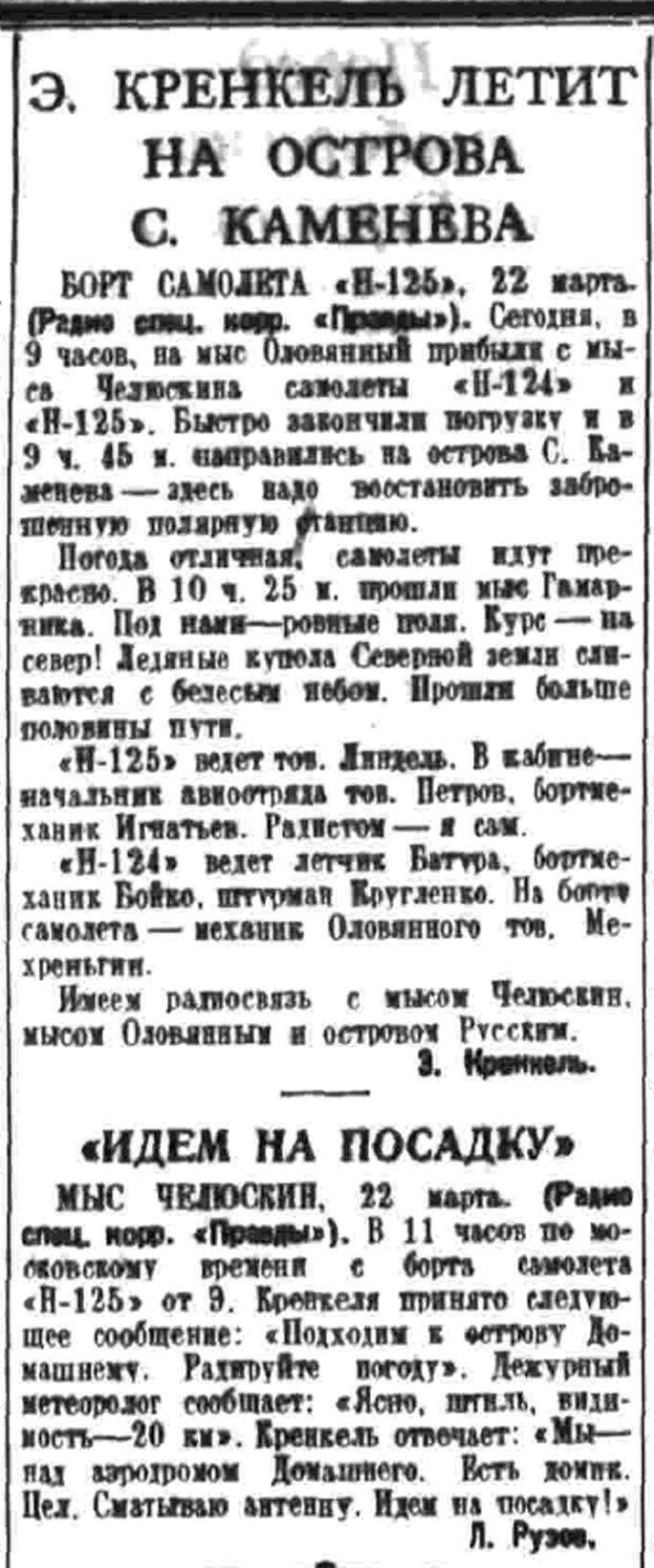 МЫС ЧЕЛЮСКИН. 22 марта. (Радио спец. корр. "Правды"). В 11 часов по московскому времени с борта самолёта "Н-125" от Э. Кренкеля принято следующее сообщение: "Подходим к острову Домашнему. Радируйте погоду". Дежурный метеоролог сообщает: "Ясно, штиль, видимость — 20 км". Кренкель отвечает: "Мы — над аэродромом Домашнего. Есть домик. Цел. Сматываю антенну. Идем на посадку! ".