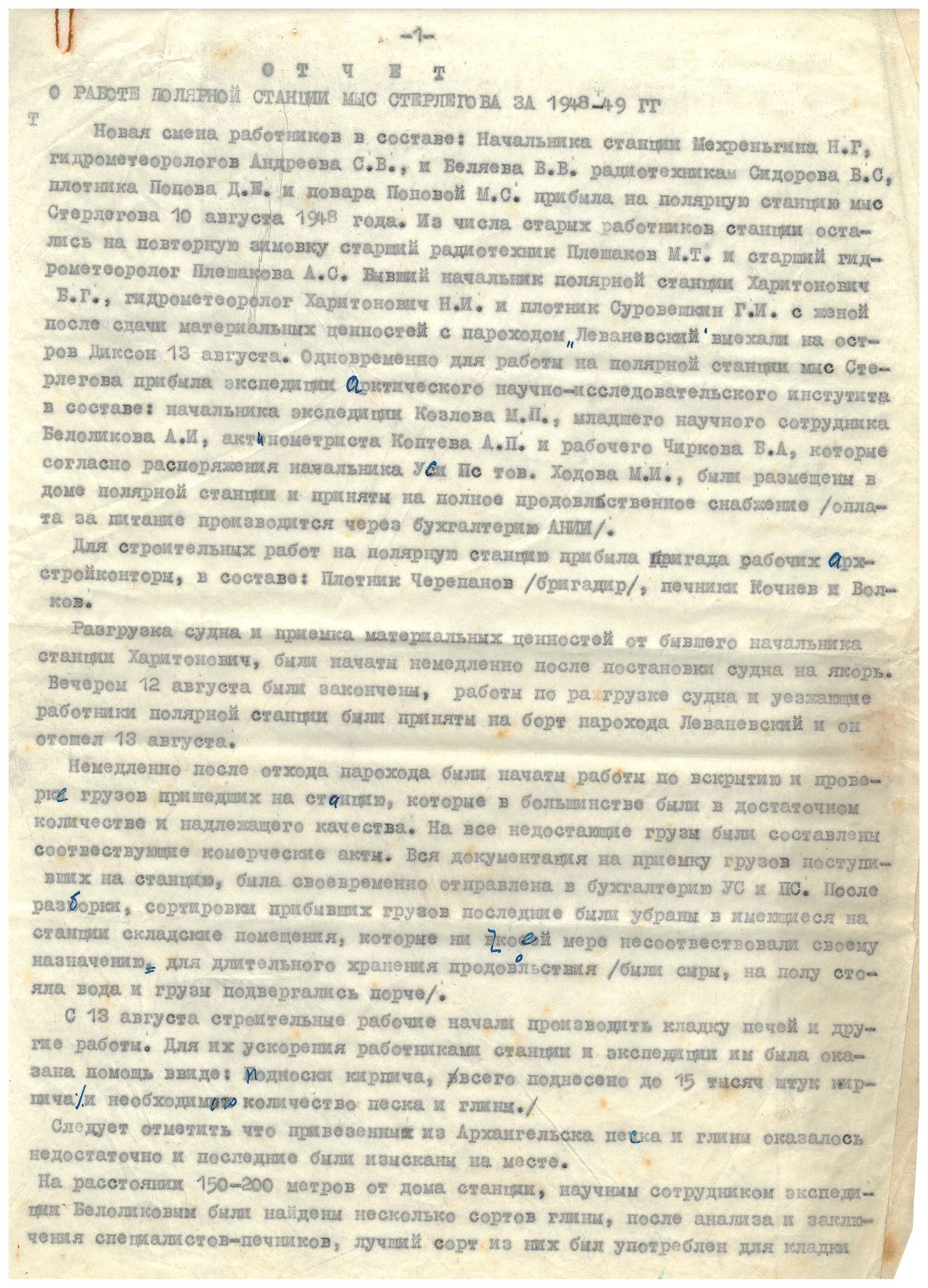 Новая смена работников в составе: Начальника станции Мехреньгина Н. Г., гидрометеорологов Андреева С. В., и Беляева В. В. радиотехника Сидорова В. С., плотника Попова Д. Е. и повара Поповой Н. С. прибыла на полярную станцию мыс Стерлегова 10 августа 1948 года. Из числа старых работников станции остались на повторную зимовку старший радиотехник Плешаков М. Т. и старший гидрометеоролог Плешакова А. С. Бывший начальник полярной станции Харитонович Б. Г., гидрометеоролог Харитонович Н. И. и плотник Суровешкин Г. И. с женой после сдачи материальных ценностей с пароходом "Леваневский" выехали на остров Диксон 13 августа. Одновременно для работы на полярной станции мыс Стерлегова прибыла экспедиция Арктического научно-исследовательского института в составе: начальника экспедиции Козлова М. П., младшего научного сотрудника Белоликова А. И., актинометриста Коптева А. П. и рабочего Чиркова Б. А., которые согласно распоряжения начальника УС и ПС тов. Ходова М. И.[?], были размещены в доме полярной станции и приняты на полное продовольственное снабжение /оплата за питание производится через бухгалтерию АНИИ/.