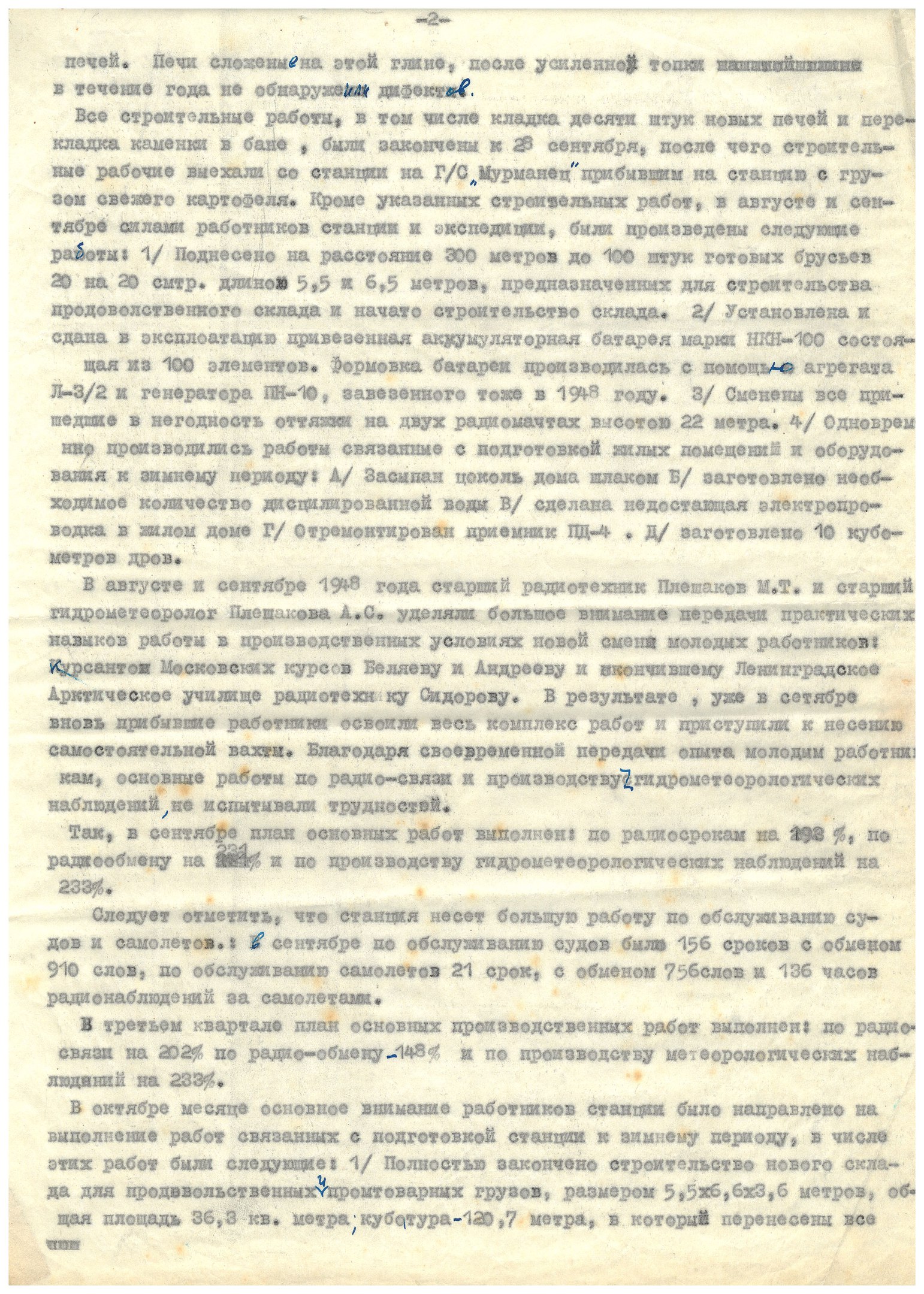 Все строительные работы, в том числе кладка десяти штук новых печей и перекладка каменки в бане, была закончена к 28 сентября, после чего строительные рабочие выехали со станции на Г/С "Мурманец" прибывшим на станцию с грузом свежего картофеля. Кроме указанных строительных работ, в августе и сентябре силами работников станции и экспедиции, были произведены следующие работы: 1/ Поднесено на расстояние 300 метров до 100 штук готовых брусьев 30 на 20 смтр. длиною 5,5 и 6,5 метров, предназначенных для строительства продовольственного склада и начато строительство склада. 2/ Установлена и сдана в эксплоатацию привезенная аккумуляторная батарея марки НКН-100 состоящая из 100 элементов. Формовка батареи производилась с помощью агрегата Л-3/2 и генератора ПН-10, завезенного тоже в 1948 году. 3/ Сменены все пришедшие в негодность оттяжки на двух радиомачтах высотою 22 метра. 4/ Одновременно производились работы связанные с подготовкой жилых помещений и оборудования к зимнему периоду: А/ Засыпан цоколь дома шлаком Б/ заготовлено необходимое количество дистиллированной воды В/ сделана недостающая электропроводка в жилом доме Г/ Отремонтирован приемник ПД-4. Д/ заготовлено 10 кубометров дров.