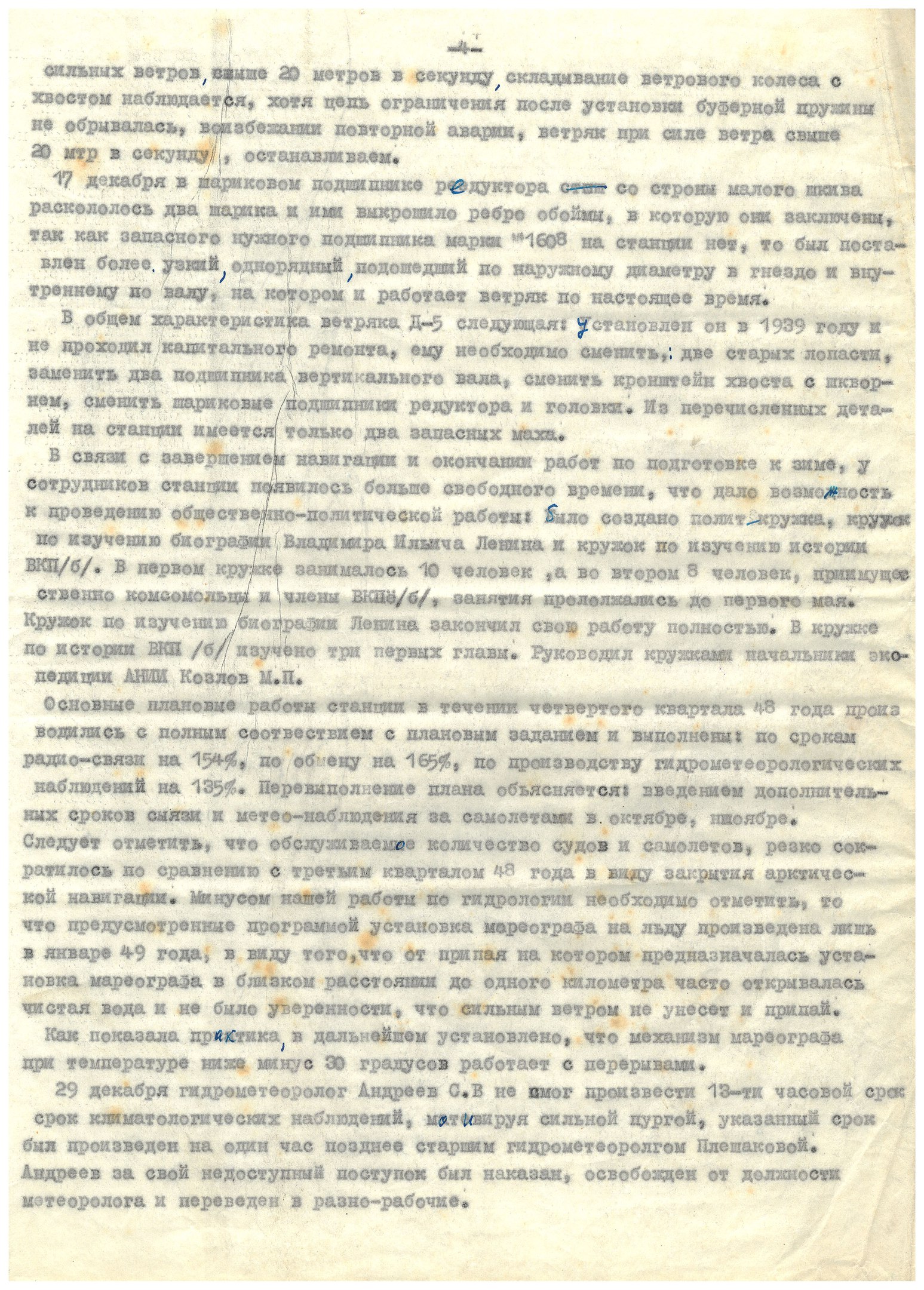 Андреев в декабре 1948 г. опоздал на один час климатологического срока метеонаблюдений и имеет ряд других опущений в работе, за что был отстранен от работы метеоролога и был переведен на должность разнорабочего.