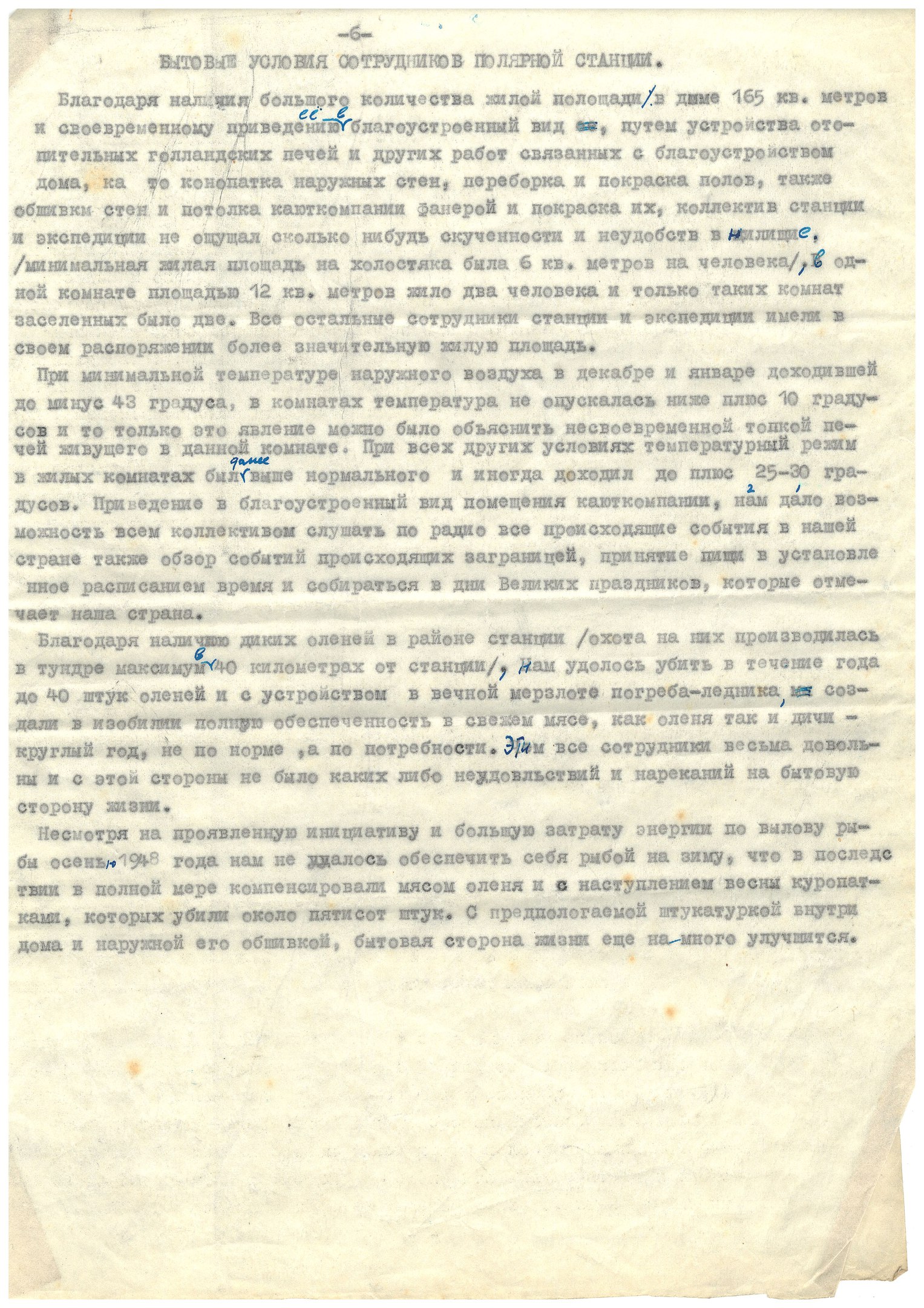 При минимальной температуре наружного воздуха в декабре и январе доходившей до минус 43 градуса, в комнатах температура не опускалась ниже плюс 16 градусов и то только это явление можно было объяснить несвоевременной топкой печей живущего в данной комнате. При всех других условиях температурный режим в жилых комнатах был даже выше нормального и иногда доходил до плюс 25-30 градусов. Приведение в благоустроенный вид помещения кают-компании, нам дало возможность всем коллективом слушать по радио все происходящие события в нашей стране также обзор событий происходящие заграницей, принятие пищи в установленное расписанием время и собираться в дни Великих праздников, которые отмечает наша страна.