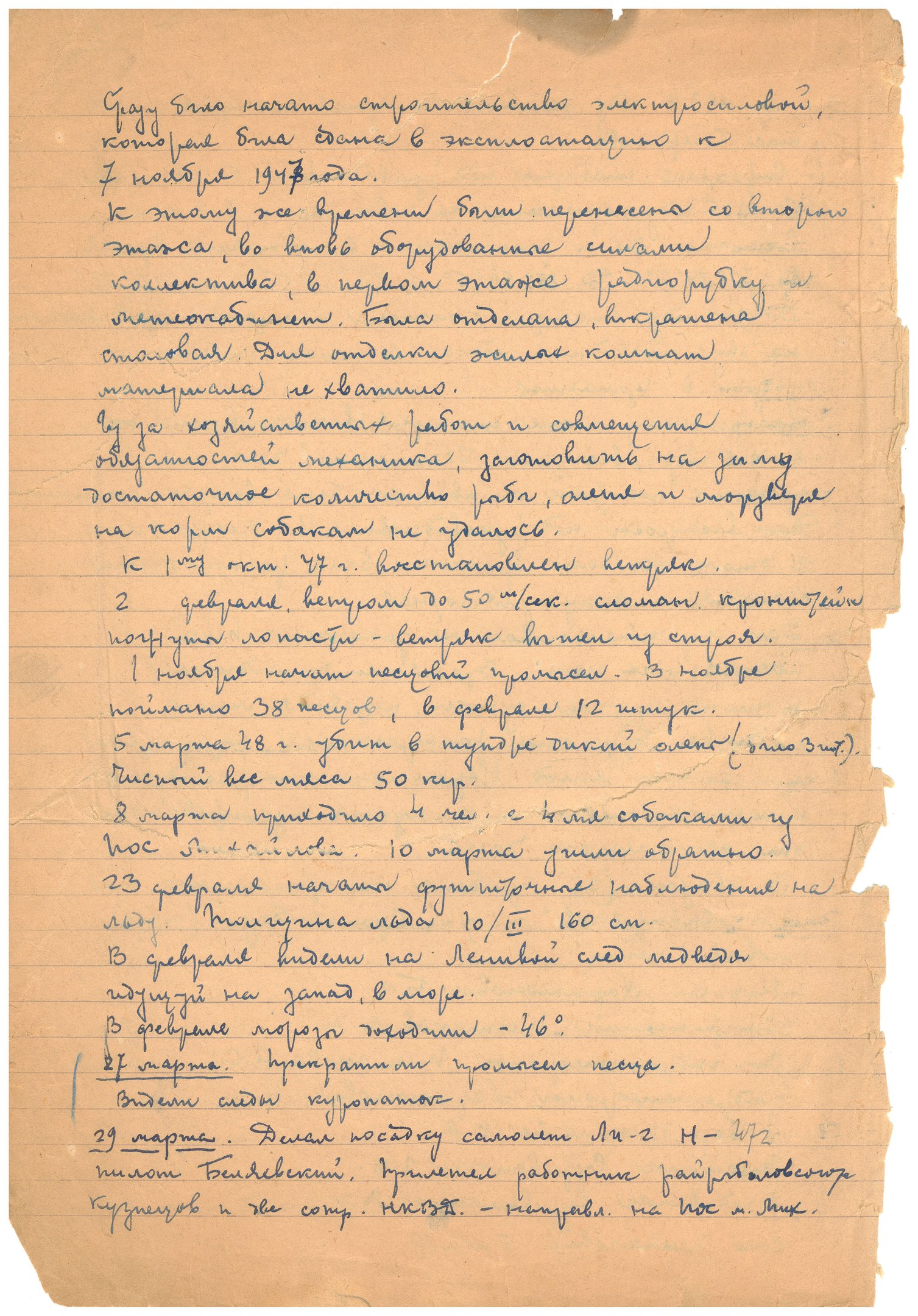 Основные плановые работы станции в октябре 1948 года производились в соответствии с программой и выполнены: по радио-связи на 170%, по обмену на 168%, кроме этого было 276 сроков связи с судами при обмене 5520 слов и 319 часов дополнительных сроков наблюдений и дачи радио-пеленгов судам. 5 сроков связей с самолетами: при обмене 209 слов и 31 час наблюдений слуховой радио-вахты за самолетами. Таким образом в октябре месяце были закончены все наружные основные работы связанные с подготовкой к зимнему периоду и в ноябре приступили к благоустройству внутри жилых помещений: сделана переборка и покраска полов в трех жилых комнатах с подсыпкой под пол шлака общей площадью 50 кв. метров.
