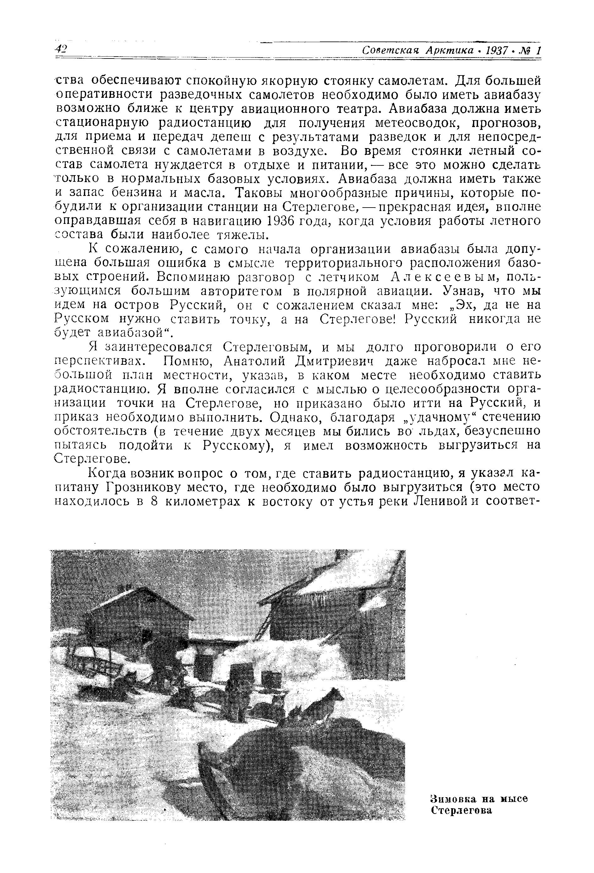 ства обеспечивают спокойную якорную стоянку самолетам. Для большей оперативности разведочных самолетов необходимо было иметь авиабазу возможно ближе к центру авиационного театра. Авиабаза должна иметь стационарную радиостанцию для получения метеосводок, прогнозов, для приема и передач депеш с результатами разведок и для непосредственной связи с самолетами в воздухе. Во время стоянки летный состав самолета нуждается в отдыхе и питании, — все это можно сделать только в нормальных базовых условиях. Авиабаза должна иметь также и запас бензина и масла. Таковы многообразные причины, которые побудили к организации станции на Стерлегове, — прекрасная идея, вполне оправдавшая себя в навигацию 1936 года, когда условия работы летного состава были наиболее тяжелы.