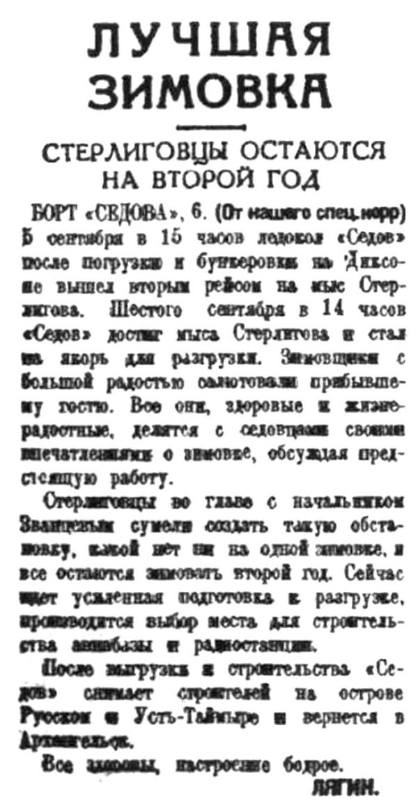 Стерлиговцы во главе с начальником Званцевым сумели создать такую обстановку, какой нет ни на одной зимовке, и все остаются зимовать второй год. Сейчас идет усиленная подготовка к разгрузке, производится выбор места для строительства авиабазы и радиостанции.
