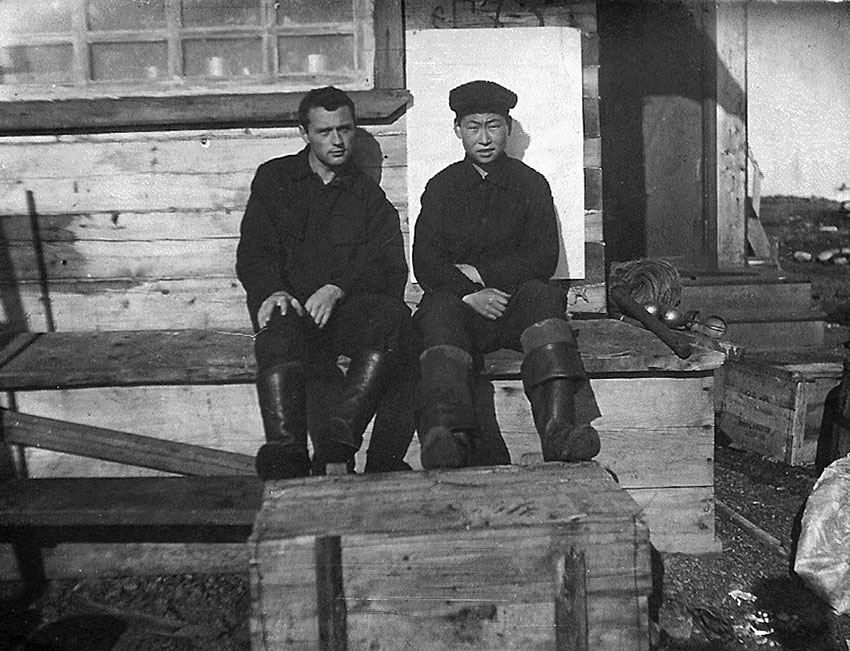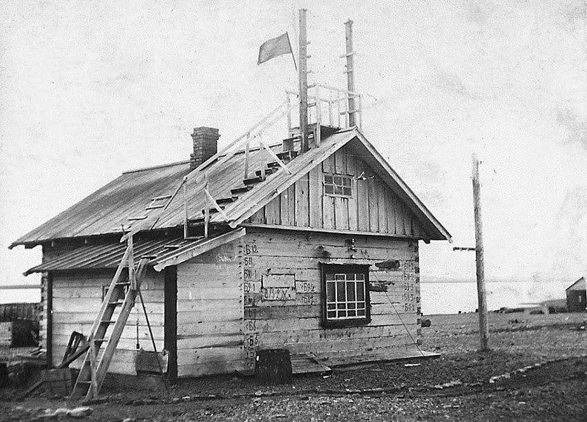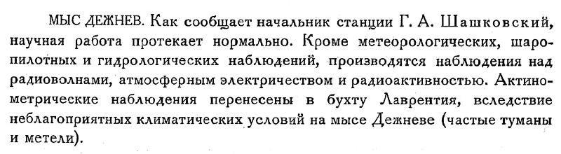 МЫС ДЕЖНЕВ. Как сообщает начальник станции Г. А. Шашковский, научная работа протекает нормально. Кроме метеорологических, шаропилотных и гидрологических наблюдений, производятся наблюдения над радиоволнами, атмосферным электричеством и радиоактивностью. Актинометрические наблюдения перенесены в бухту Лаврентия, вследствие неблагоприятных климатических условий на мысе Дежневе (частые туманы и метели).