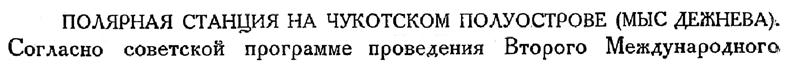 Согласно советской программе проведения Второго Международного полярного года, местом станции МПГ на Чукотском п-ове было избрано селение Уэллен, где предполагалась установка станции, ведущей цикл работ по программе полярных обсерваторий. Редакцией получено письмо начальника станции Г. А. Шашковского, датированное 17 августа с. г., в котором сообщается, что непредвиденные обстоятельства (задержка на длинном перегоне железной дороги от Москвы до Владивостока вагона с обмундированием, оборудованием и пр.) заставили экспедицию задержаться во Владивостоке после ухода рейсового парохода к Чукотскому п-ову и отбыть 9 июня на китайском пароходе „Юанта“. 15 августа пароход достиг мыса Дежнева. Ввиду того, что с северной и северовосточной стороны Чукотского п-ова в это время находилось большое количество дрейфующего крупно-битого льда и подход к селению Уэллен оказался для обыкновенного парохода, каким является „Юанта", невозможным, а переброска всех грузов с Дежнева в Уэллен заняла бы слишком много времени, — пришлось местом будущей станции избрать небольшую песчаную косу у поста Дежнева. К моменту отправки письма все грузы были уже на берегу, и началась сборка жилого дома, двух магнитных павильонов, дома, обсерватории и постройки для кухни и бани. Состав станции на мысе Дежнева: