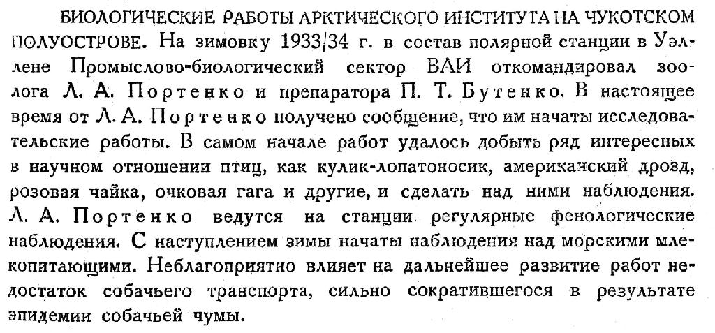 БИОЛОГИЧЕСКИЕ РАБОТЫ АРКТИЧЕСКОГО ИНСТИТУТА НА ЧУКОТСКОМ ПОЛУОСТРОВЕ. На зимовку 1933/34 г. в состав полярной станции в Уэллене Промыслово-биологический сектор ВАИ откомандировал зоолога Л. А. Портенко и препаратора П. Т. Бутенко. В настоящее время от Л. А. Портенко получено сообщение, что им начаты исследовательские работы. В самом начале работ удалось добыть ряд интересных в научном отношении птиц, как кулик-лопатоносик, американский дрозд, розовая чайка, очковая гага и другие, и сделать над ними наблюдения. Л. А. Портенко ведутся на станции регулярные фенологические наблюдения. С наступлением зимы начаты наблюдения над морскими млекопитающими. Неблагоприятно влияет на дальнейшее развитие работ недостаток собачьего транспорта, сильно сократившегося в результате эпидемии собачьей чумы.
