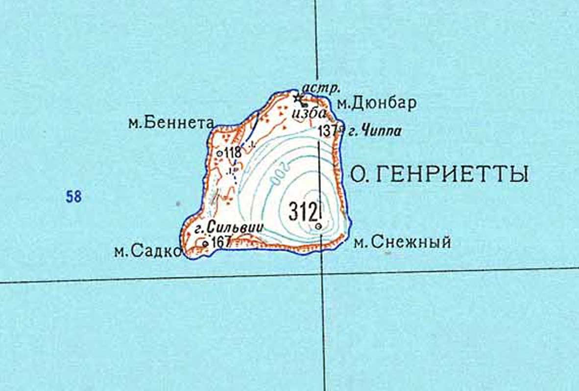 Третья высокоширотная экспедиция на «Садко» в 1937 году, успешно плавая севернее Новосибирских островов, где искала и не нашла Землю Санникова, организовала полярную станцию на острове Генриетты. Из статьи В. Ю. Визе «Остров Генриетты» («Советская Арктика», № 5, 1938): «Остров Генриетты был открыт случайно во время дрейфа судна «Жаннетта» американской экспедиции Де-Лонга... В первых числах июня 1881 г. на остров была отправлена партия под начальством инженера-механика Мельвиля, который произвел частичную опись острова и сложил на нем каменный гурий, положив внутрь его цинковую банку и медную трубку с записками. С тех пор прошло 56 лет, и за это время небольшой остров, затерянный среди полярных льдов и обозначенный на карте в виде черной точки, не посещался ни разу».
