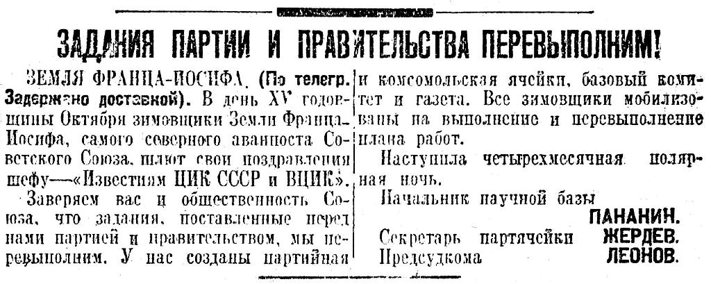 — Первая советская зимовка на архипелаге Франца Иосифа прошла прекрасно. Она лучшая из всех, которые я и мои товарища проводили раньше на полярных радиостанциях. Это несмотря на то, что остановка зимовки была как раз наиболее тяжелой.