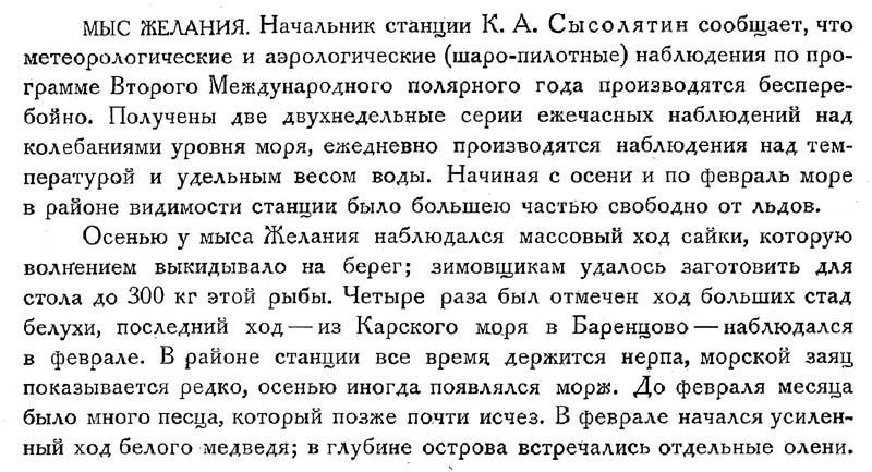 МЫС ЖЕЛАНИЯ. Начальник станции К. А. Сысолятин сообщает, что метеорологические и аэрологические (шаро-пилотные) наблюдения по программе Второго Международного полярного года производятся бесперебойно. Получены две двухнедельные серии ежечасных наблюдений над колебаниями уровня моря, ежедневно производятся наблюдения над температурой и удельным весом воды. Начиная с осени и по февраль море в районе видимости станции было большею частью свободно от льдов.