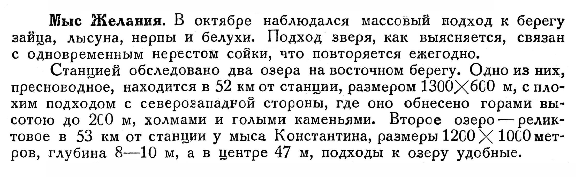 МЫС ЖЕЛАНИЯ. В области гидрологии с 1 октября по 20 ноября 1933 г. выполнены следующие работы: взято шесть гидрологических станций, составлены ежедневные карты состояния льда в районе мыса Желания, беспрерывно ведутся наблюдения над температурой воды, волнением и колебанием уровня. Установлен футшток для производства ежечасных наблюдений в течение всего месяца.