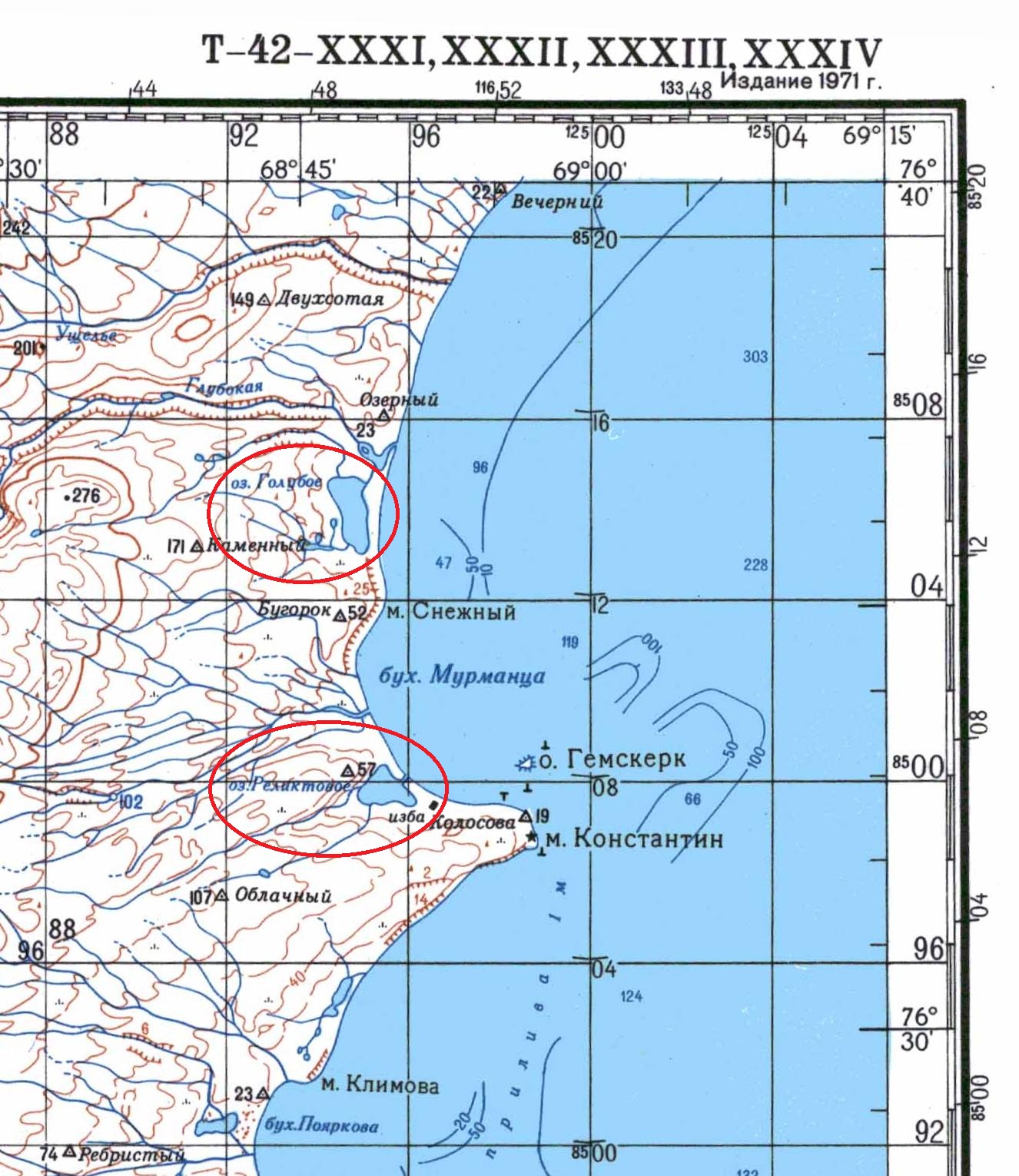 Станцией обследовано два озера на восточном берегу. Одно из них, пресноводное, находится в 52 км от станции, размером 1300 X 600 м, с плохим подходом с северозападной стороны, где оно обнесено горами высотою до 200 м, холмами и голыми каменьями. Второе озеро — реликтовое в 53 км от станции у мыса Константина, размеры 1200 X 1000 метров, глубина 8—10 м, а в центре 47 м, подходы к озеру удобные.