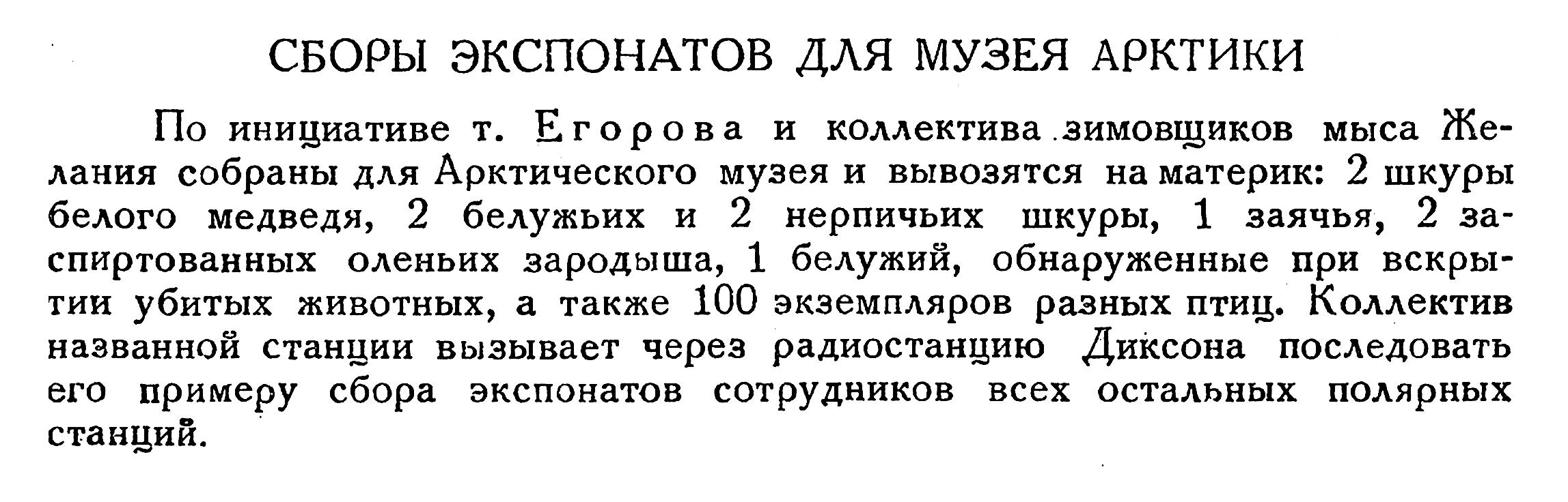 По инициативе т. Егорова и коллектива зимовщиков мыса Желания собраны для Арктического музея и вывозятся на материк: 2 шкуры белого медведя, 2 белужьих и 2 нерпичьих шкуры, 1 заячья, 2 заспиртованных оленьих зародыша, 1 белужий, обнаруженные при вскрытии убитых животных, а также 100 экземпляров разных птиц. Коллектив названной станции вызывает через радиостанцию Диксона последовать его примеру сбора экспонатов сотрудников всех остальных полярных станций.