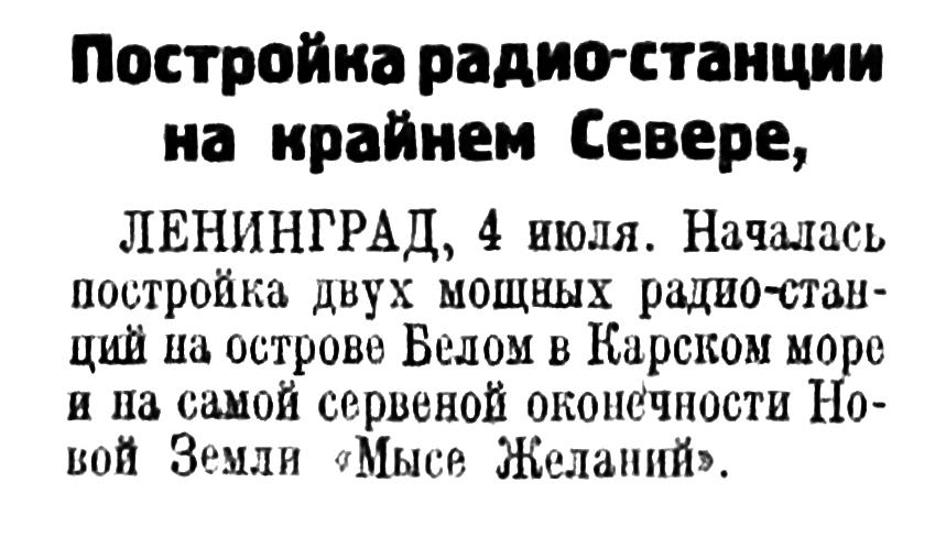 ЛЕНИНГРАД, 4 июля. Началась постройка двух мощных радио-станций на острове Белом в Карском море и на самой серверной оконечности Новой Земли «Мысе Желаний».