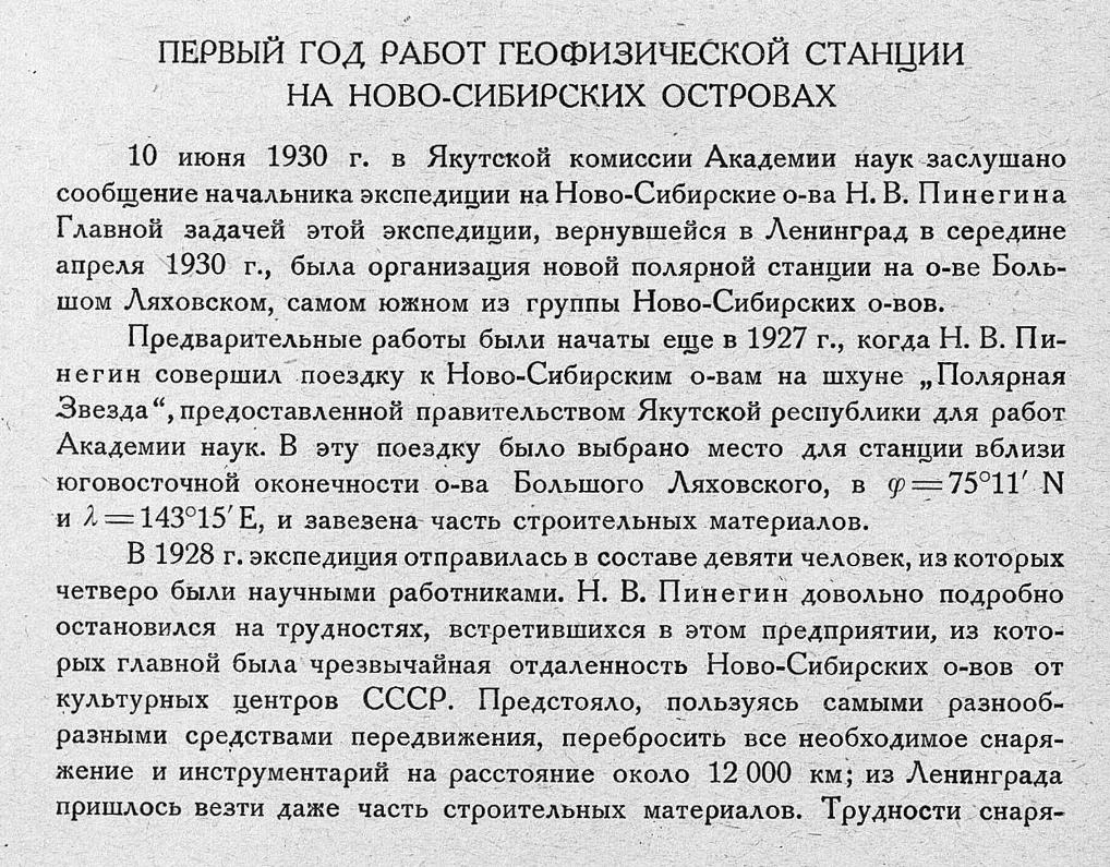 10 июня 1930 г. в Якутской комиссии Академии наук заслушано сообщение начальника экспедиции на Ново-Сибирские о-ва Н. В. Пинегина. Главной задачей этой экспедиции, вернувшейся в Ленинград в середине апреля 1930 г., была организация новой полярной станции на о-ве Большом Ляховском, самом южном из группы Ново-Сибирских о-вов.