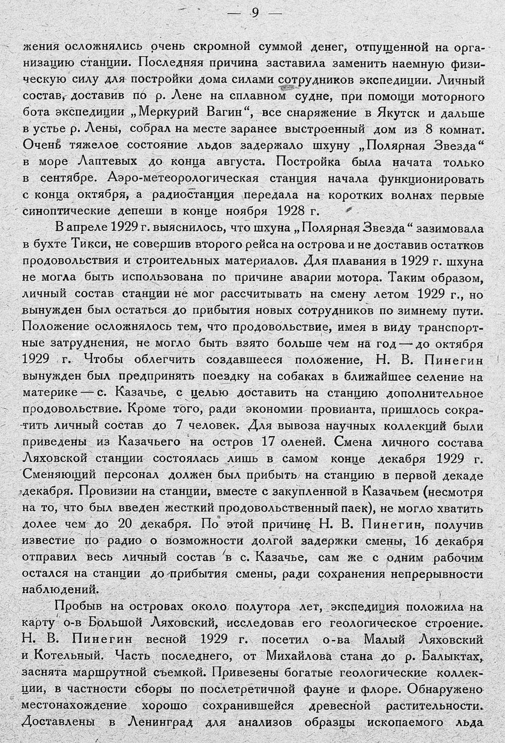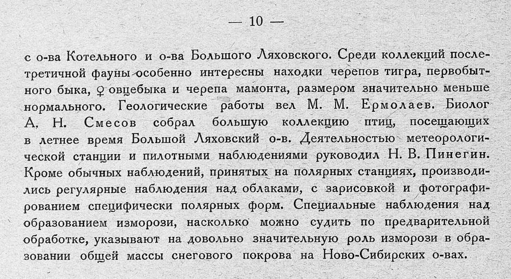 с о-ва Котельного и о-ва Большого Ляховского. Среди коллекций послетретичной фауны особенно интересны находки черепов тигра, первобытного быка, ♀ овцебыка и черепа мамонта, размером значительно меньше нормального. Геологические работы вел М. М. Ермолаев. Биолог А. Н. Смесов собрал большую коллекцию птиц, посещающих в летнее время Большой Ляховский о-в. Деятельностью метеорологической станции и пилотными наблюдениями руководил Н. В. Пинегин. Кроме обычных наблюдений, принятых на полярных станциях, производились регулярные наблюдения над облаками, с зарисовкой и фотографированием специфически полярных форм. Специальные наблюдения над образованием изморози, насколько можно судить по предварительной обработке, указывают на довольно значительную роль изморози в образовании общей массы снегового покрова на Ново-Сибирских о-вах.