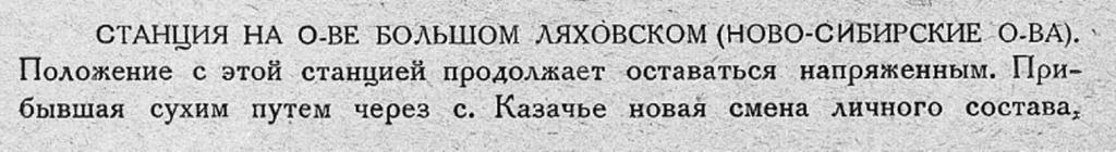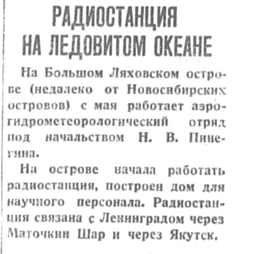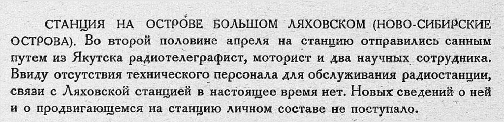 СТАНЦИЯ НА ОСТРОВЕ БОЛЬШОМ ЛЯХОВСКОМ (НОВО-СИБИРСКИЕ ОСТРОВА). Во второй половине апреля на станцию отправились санным путем из Якутска радиотелеграфист, моторист и два научных сотрудника. Ввиду отсутствия технического персонала для обслуживания радиостанции, связи с Ляховской станцией в настоящее время нет. Новых сведений о ней и о продвигающемся на станцию личном составе не поступало.