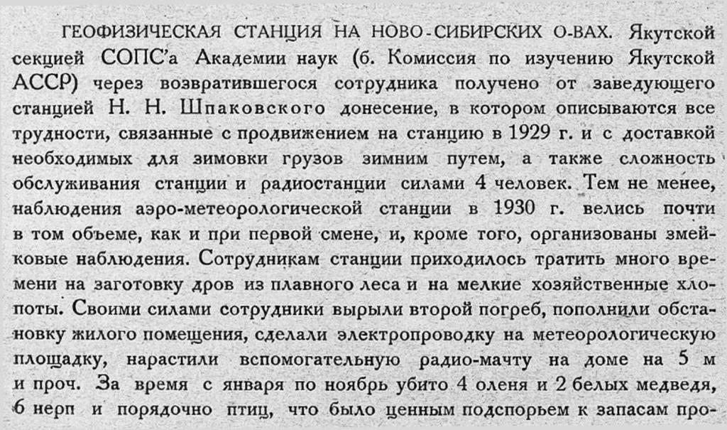 ГЕОФИЗИЧЕСКАЯ СТАНЦИЯ НА НОВО - СИБИРСКИХ О-ВАХ. Якутской секцией СОПС’а Академии наук (б. Комиссия по изучению Якутской АССР) через возвратившегося сотрудника получено от заведующего станцией Н. Н. Шпаковского донесение, в котором описываются все трудности, связанные с продвижением на станцию в 1929 г. и с доставкой необходимых для зимовки грузов зимним путем, а также сложность обслуживания станции и радиостанции силами 4 человек. Тем не менее, наблюдения аэро-метеорологической станции в 1930 г. велись почти в том объеме, как и при первой смене, и, кроме того, организованы змейковые наблюдения. Сотрудникам станции приходилось тратить много времени на заготовку дров из плавного леса и на мелкие хозяйственные хлопоты. Своими силами сотрудники вырыли второй погреб, пополнили обстановку жилого помещения, сделали электропроводку на метеорологическую площадку, нарастили вспомогательную радио-мачту на доме на 5 м и проч. За время с января по ноябрь убито 4 оленя и 2 белых медведя, 6 нерп и порядочно птиц, что было ценным подспорьем к запасам продовольствия. Станция нередко посещалась островными промышленниками; двое из них впервые остались на зимовку в становище неподалеку от станции.