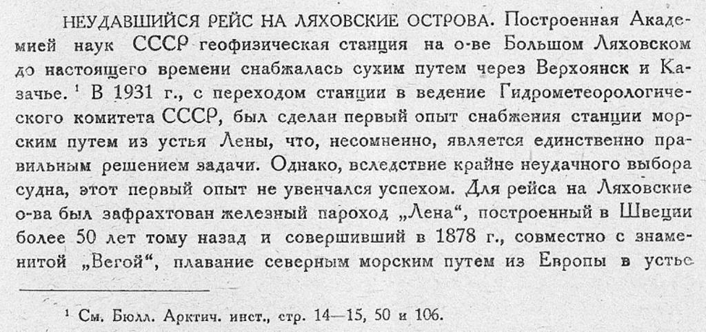 НЕУДАВШИЙСЯ РЕЙС НА ЛЯХОВСКИЕ ОСТРОВА. Построенная Академией наук СССР геофизическая станция на о-ве Большом Ляховском до настоящего времени снабжалась сухим путем через Верхоянск и Казачье. {1} В 1931 г., с переходом станции в ведение Гидрометеорологического комитета СССР, был сделан первый опыт снабжения станции морским путем из устья Лены, что, несомненно, является единственно правильным решением задачи. Однако, вследствие крайне неудачного выбора судна, этот первый опыт не увенчался успехом. Для рейса на Ляховские о-ва был зафрахтован железный пароход „Лена", построенный в Швеции более 50 лет тому назад и совершивший в 1878 г., совместно с знаменитой „Вегой", плавание северным морским путем из Европы в устье Лены. С тех пор п/х „Лена“ оставался на этой реке и в настоящее время пришел уже в ветхость.