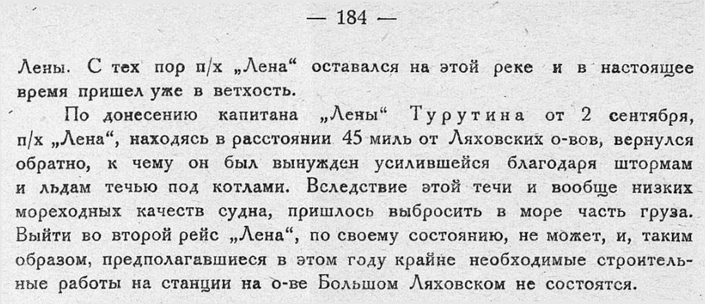 По донесению капитана „Лены“ Турутина от 2 сентября, п/х „Лена“, находясь в расстоянии 45 миль от Ляховских о-вов, вернулся обратно, к чему он был вынужден усилившейся благодаря штормам и льдам течью под котлами. Вследствие этой течи и вообще низких мореходных качеств судна, пришлось выбросить в море часть груза. Выйти во второй рейс „Лена“, по своему состоянию, не может, и, таким образом, предполагавшиеся в этом году крайне необходимые строительные работы на станции на о-ве Большом Ляховском не состоятся.