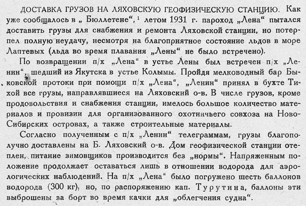 ДОСТАВКА ГРУЗОВ НА ЛЯХОВСКУЮ ГЕОФИЗИЧЕСКУЮ СТАНЦИЮ. Как уже сообщалось в „Бюллетене",{1} летом 1931 г. пароход „Лена" пытался доставить грузы для снабжения и ремонта Ляховской станции, но потерпел полную неудачу, несмотря на благоприятное состояние льдов в море Лаптевых (льда во время плавания „Лены" не было встречено).