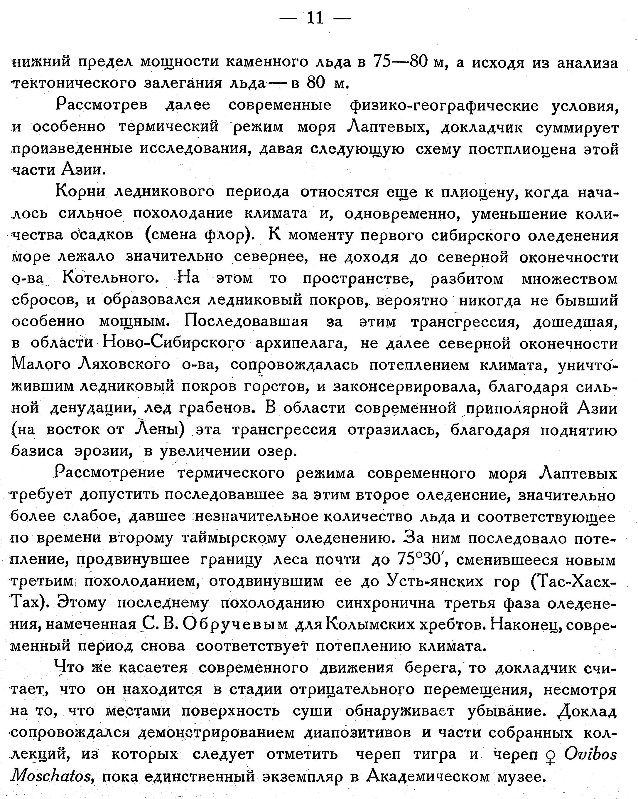 Что же касается современного движения берега, то докладчик считает, что он находится в стадии отрицательного перемещения, несмотря на то, что местами поверхность суши обнаруживает убывание. Доклад сопровождался демонстрированием диапозитивов и части собранных коллекций, из которых следует отметить череп тигра и череп ♀ Ovibos Moschatos, пока единственный экземпляр в Академическом музее.