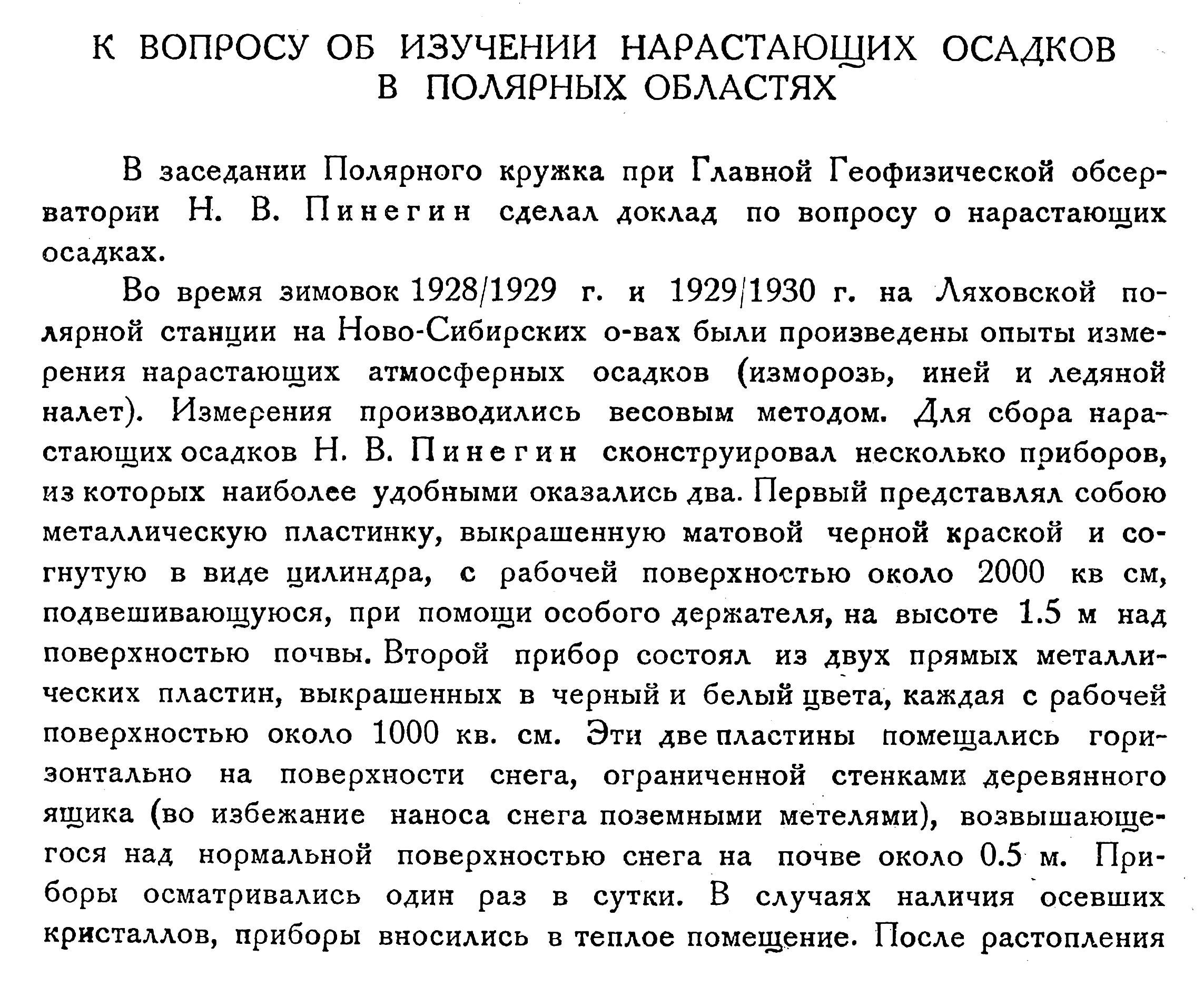 Во время зимовок 1928/1929 г. и 1929/1930 г. на Ляховской полярной станции на Ново-Сибирских о-вах были произведены опыты измерения нарастающих атмосферных осадков (изморозь, иней и ледяной налет). Измерения производились весовым методом. Для сбора нарастающих осадков Н. В. Пинегин сконструировал несколько приборов, из которых наиболее удобными оказались два. Первый представлял собою металлическую пластинку, выкрашенную матовой черной краской и согнутую в виде цилиндра, с рабочей поверхностью около 2000 кв см, подвешивающуюся, при помощи особого держателя, на высоте 1.5 м над поверхностью почвы. Второй прибор состоял из двух прямых металлических пластин, выкрашенных в черный и белый цвета, каждая с рабочей поверхностью около 1000 кв. см. Эти две пластины помещались горизонтально на поверхности снега, ограниченной стенками деревянного ящика (во избежание наноса снега поземными метелями), возвышающегося над нормальной поверхностью снега на почве около 0.5 м. Приборы осматривались один раз в сутки. В случаях наличия осевших кристаллов, приборы вносились в теплое помещение. После растопления