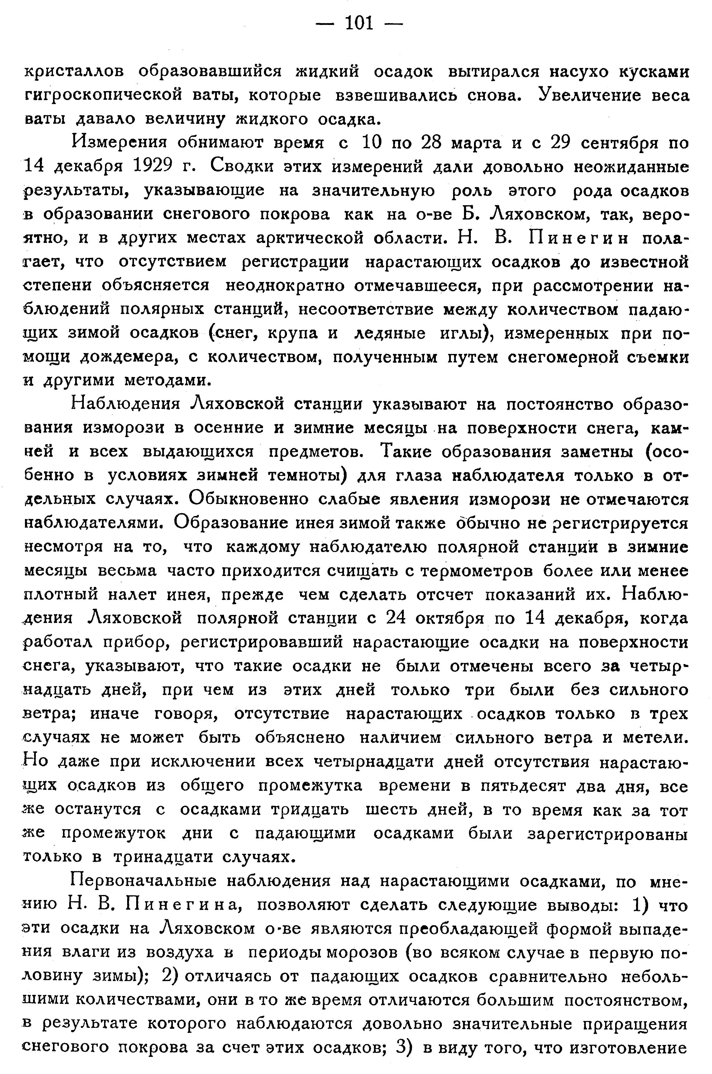 Измерения обнимают время с 10 по 28 марта и с 29 сентября по 14 декабря 1929 г. Сводки этих измерений дали довольно неожиданные результаты, указывающие на значительную роль этого рода осадков в образовании снегового покрова как на о-ве Б. Ляховском, так, вероятно, и в других местах арктической области. Н. В. Пинегин полагает, что отсутствием регистрации нарастающих осадков до известной степени объясняется неоднократно отмечавшееся, при рассмотрении наблюдений полярных станций, несоответствие между количеством падающих зимой осадков (снег, крупа и ледяные иглы), измеренных при помощи дождемера, с количеством, полученным путем снегомерной съемки и другими методами.
