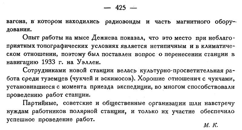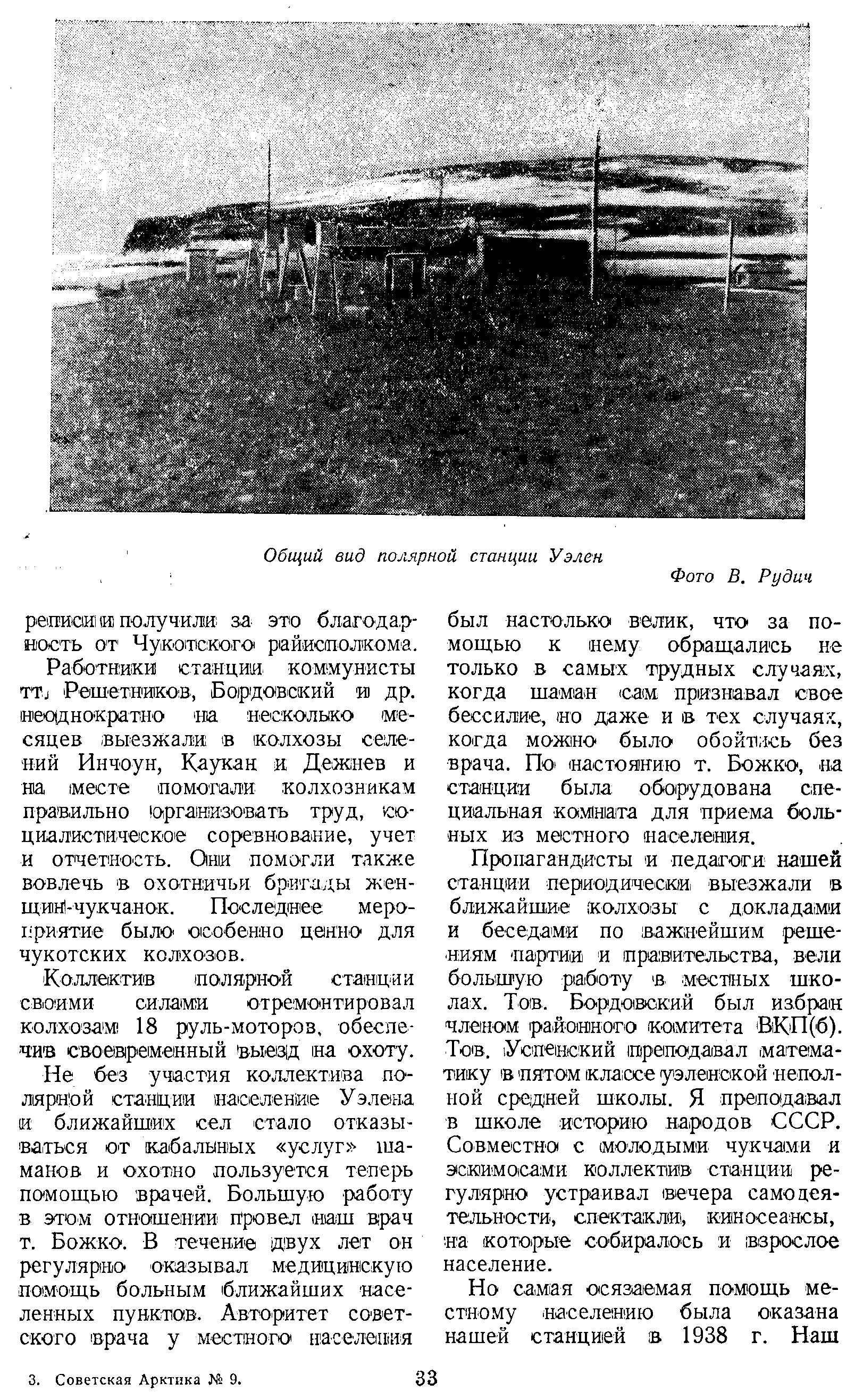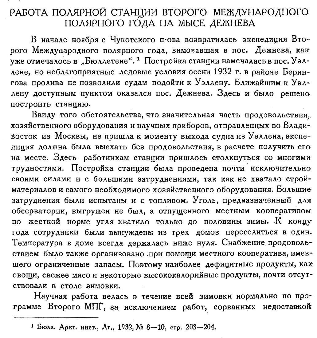 В начале ноября с Чукотского п-ова возвратилась экспедиция Второго Международного полярного года, зимовавшая в пос. Дежнева, как уже отмечалось в „Бюллетене". {1} Постройка станции намечалась в пос. Уэллене, но неблагоприятные ледовые условия осени 1932 г. в районе Берингова пролива не позволили судам подойти к Уэллену. Ближайшим к Уэллену доступным пунктом оказался пос. Дежнева. Здесь и было решено построить станцию.