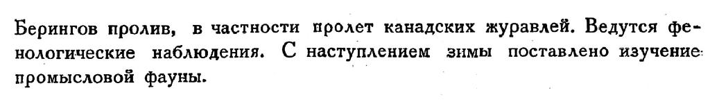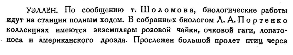 УЭЛЛЕН. По сообщению т. Шоломова, биологические работы идут на станции полным ходом. В собранных биологом Л. А. Портенко коллекциях имеются экземпляры розовой чайки, очковой гаги, лопатоноса и американского дрозда. Прослежен большой пролет птиц через Берингов пролив, в частности пролет канадских журавлей. Ведутся фенологические наблюдения. С наступлением зимы поставлено изучение^ промысловой фауны.